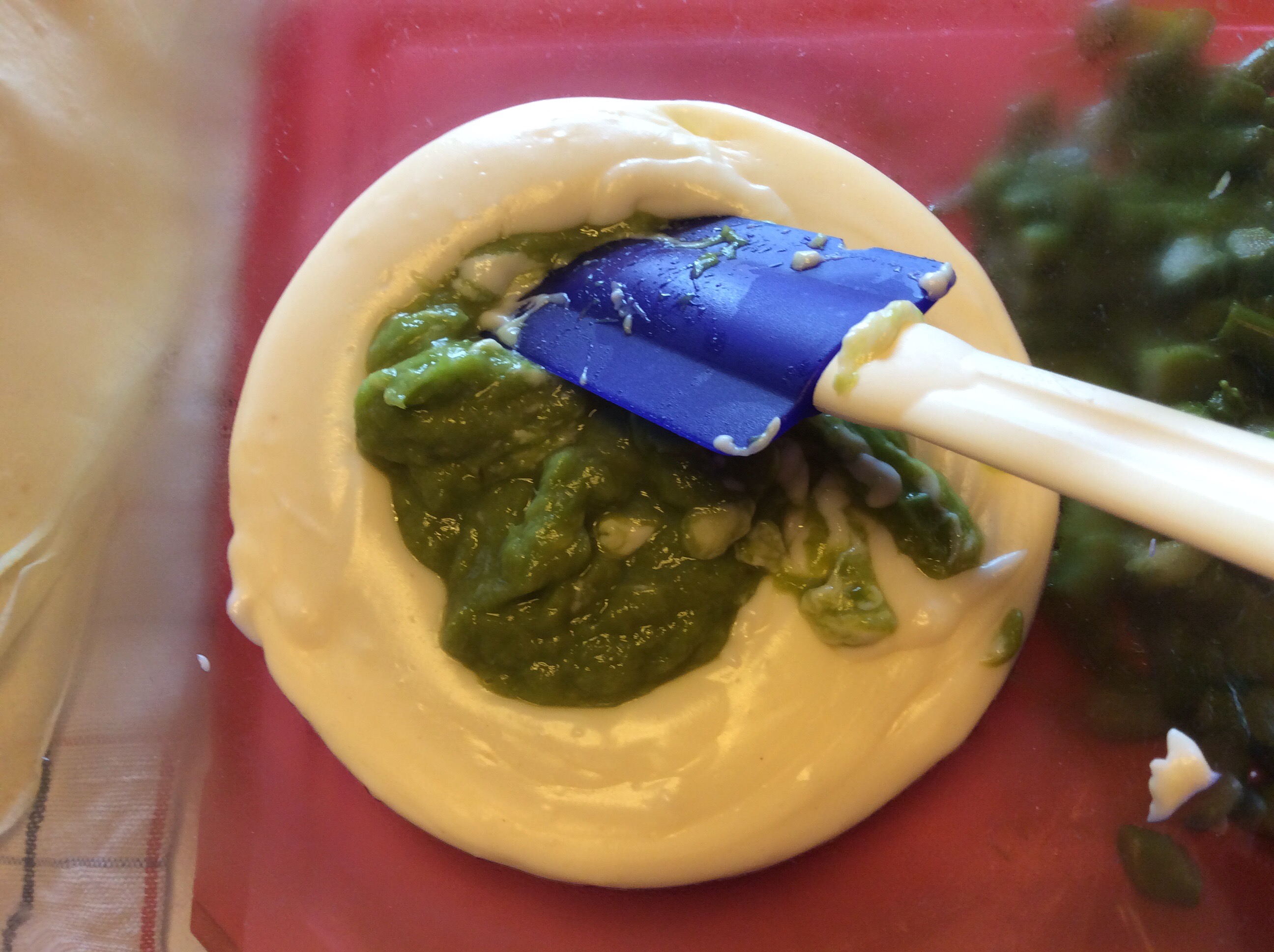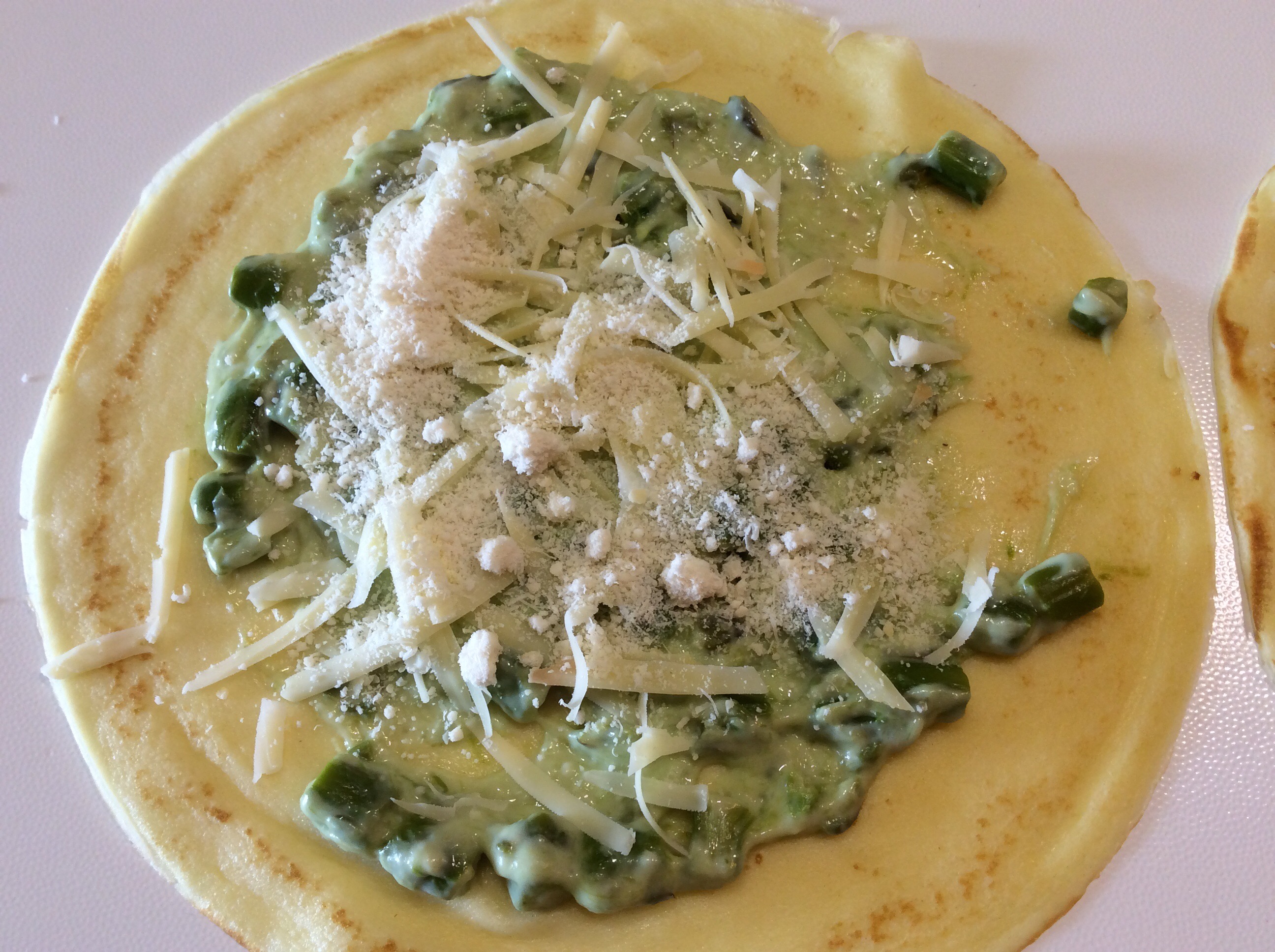 Dispongo le crespelle su un piano e distribuisco il ripieno stendendolo in maniera uniforme, aggiungo il formaggio a filetti e un pò di formaggio grattugiato