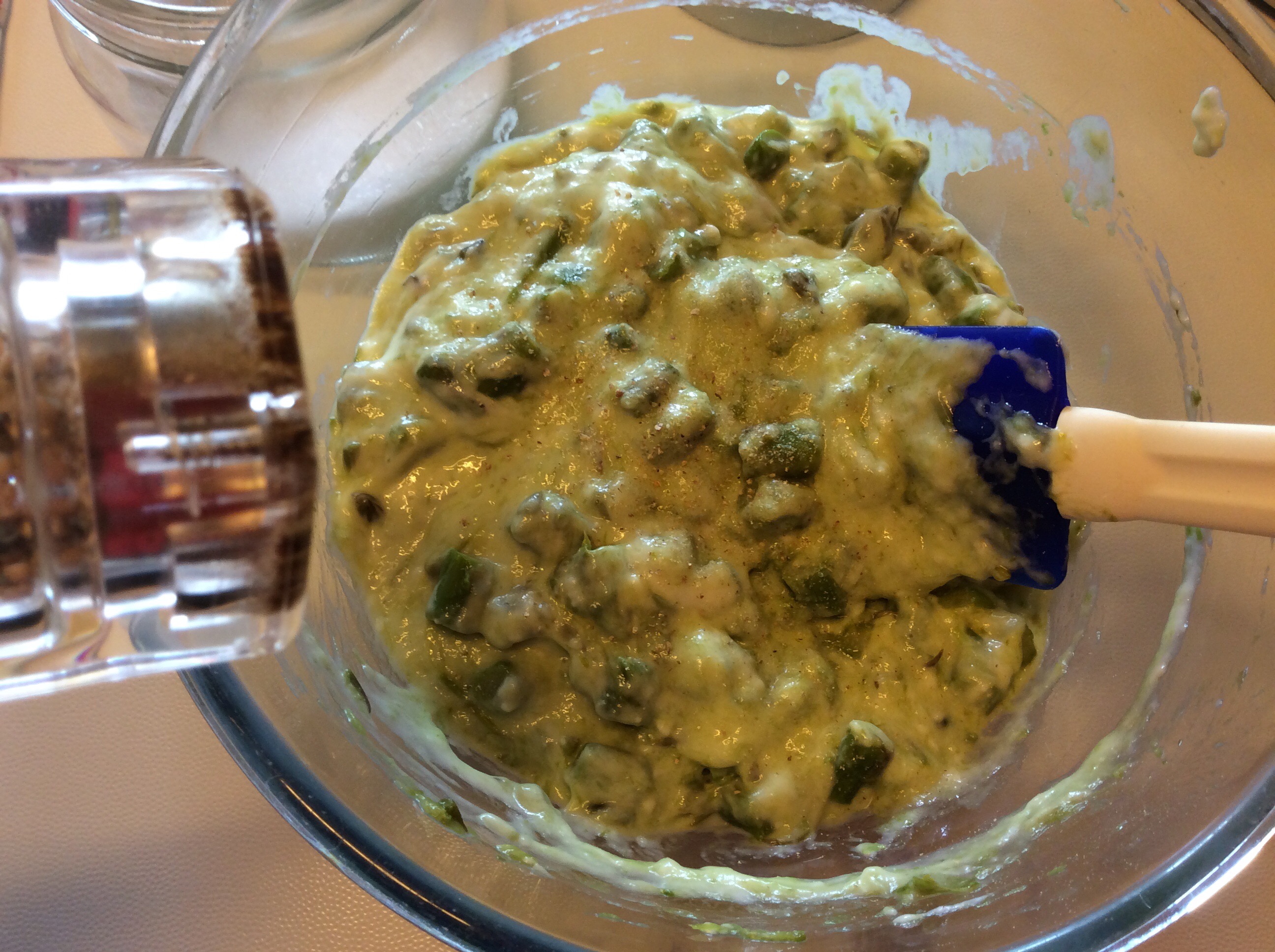 Ne verso 3/4 in una ciotola tenendone da parte una piccola quantità per la copertura e aggiungo la crema di asparagi