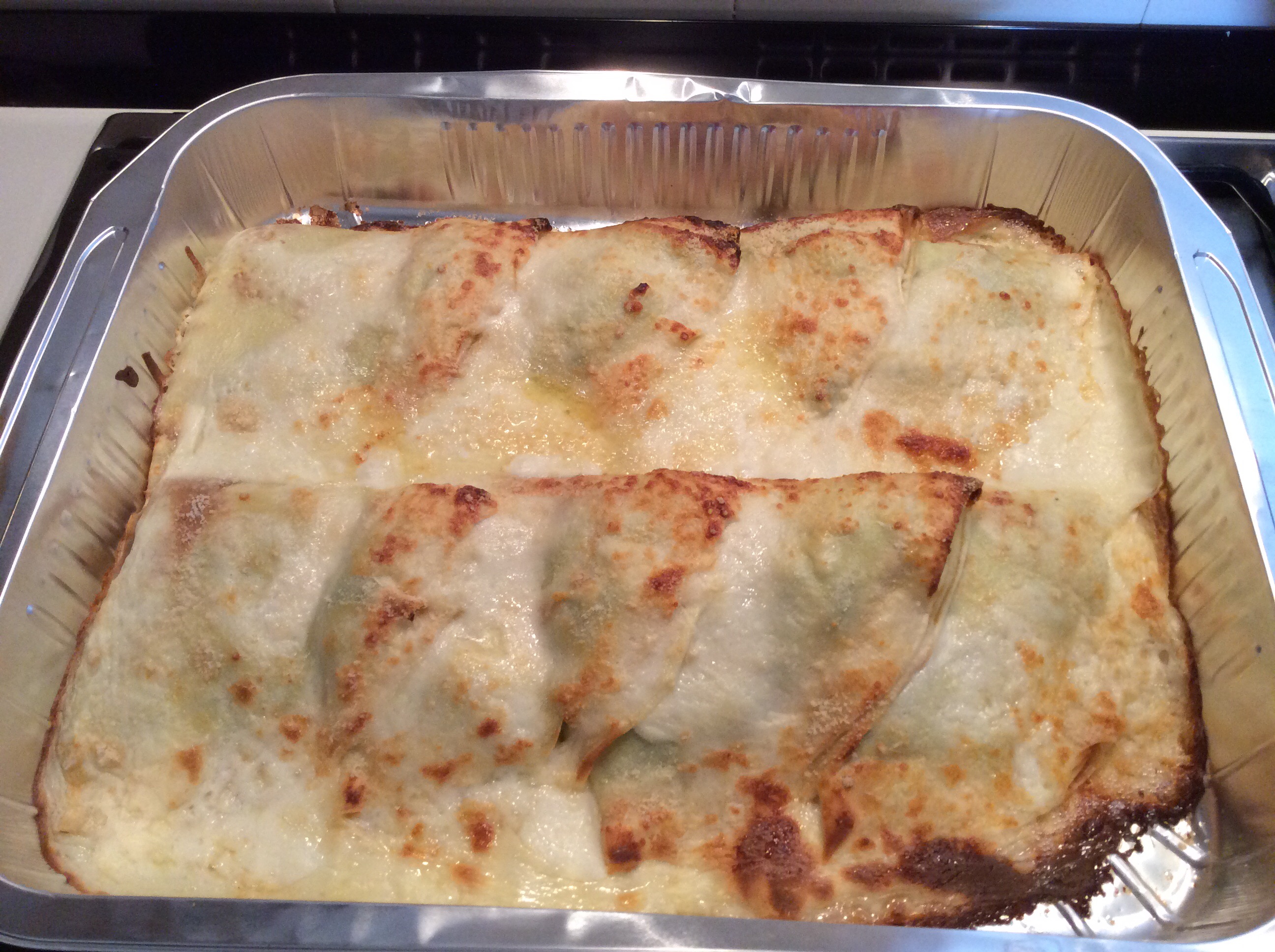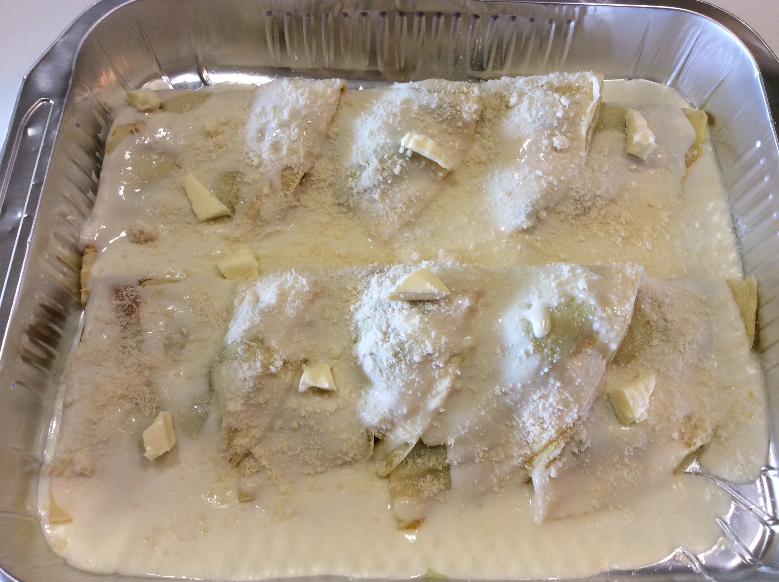 Le appoggio in una teglia imburrata, io ho adoperato una teglia in alluminio usa e getta comodissima quando si hanno ospiti, non restano poi teglie da lavare, scaldo un attimo la besciamella che avevo tenuto da parte, aggiungo un goccio di latte per renderla più fluida, la verso sulle crespelle, aggiungo del parmigiano, qualche fiocchetto di burro