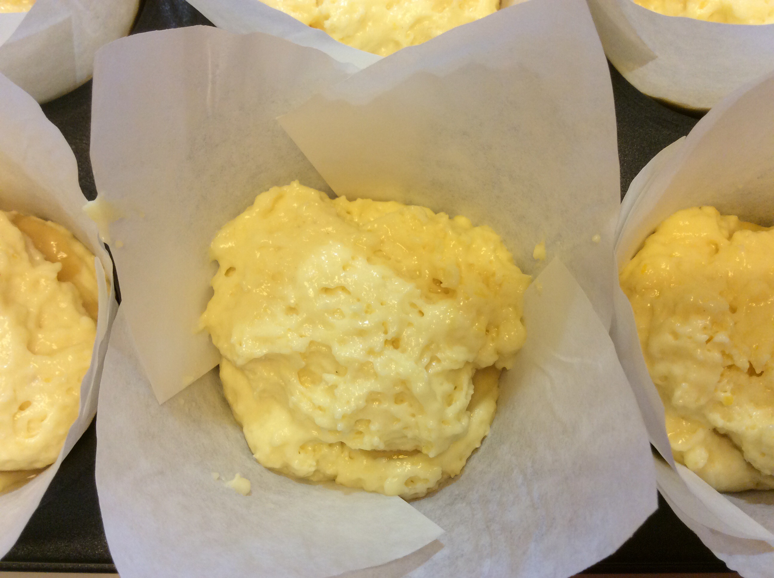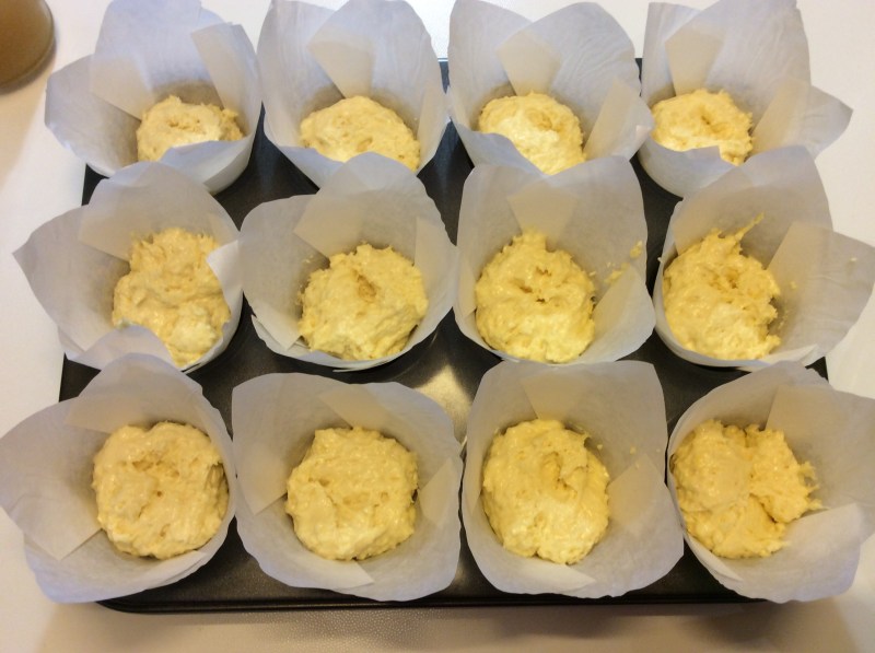 Dispongo dei pirottini di carta in uno stampo da muffin e verso in ognuno un cucchiaio scarso di impasto