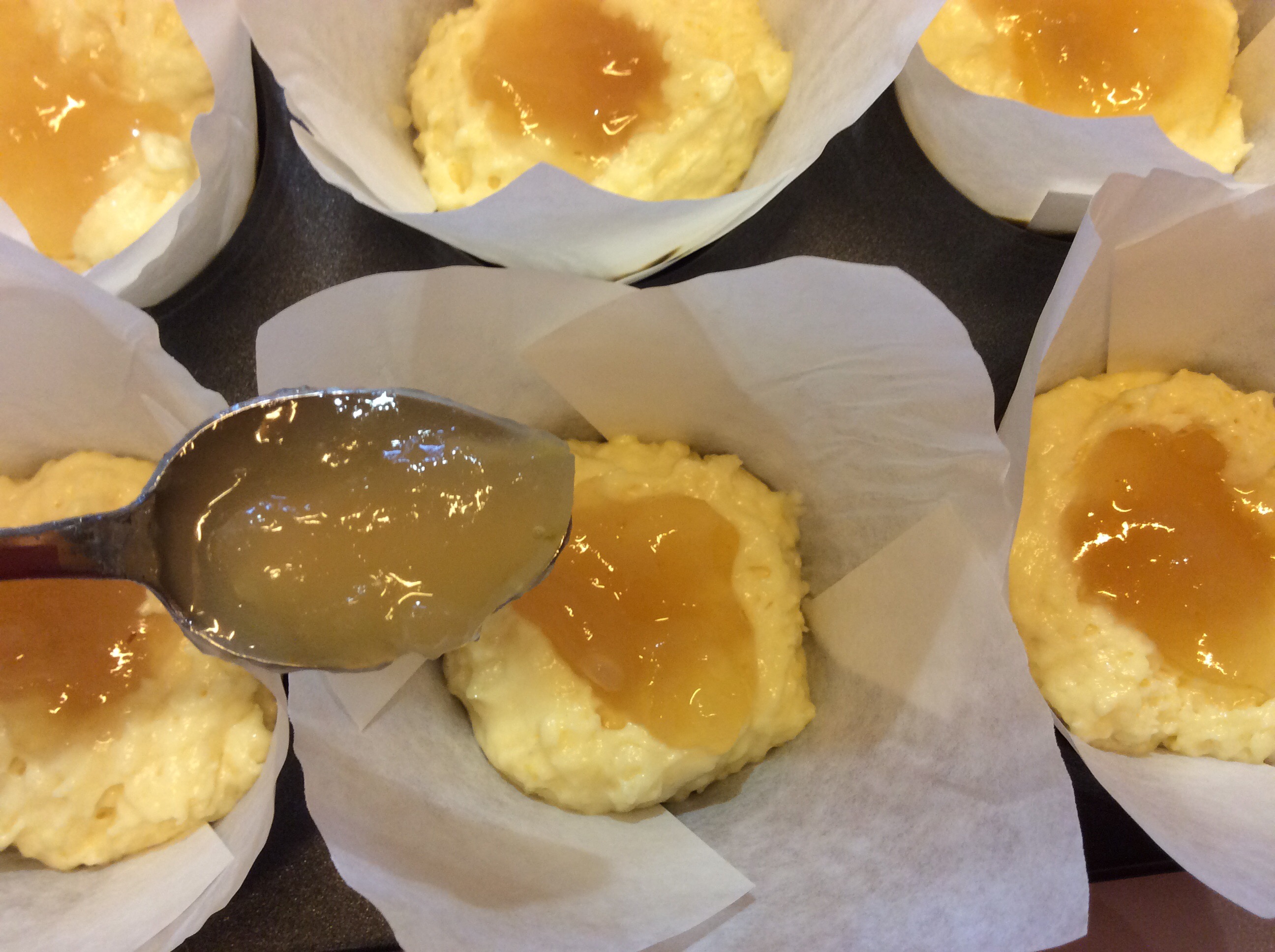 Aggiungo al centro di ogni muffin un cucchiaino di marmellata schiacciandola leggermente verso il fondo