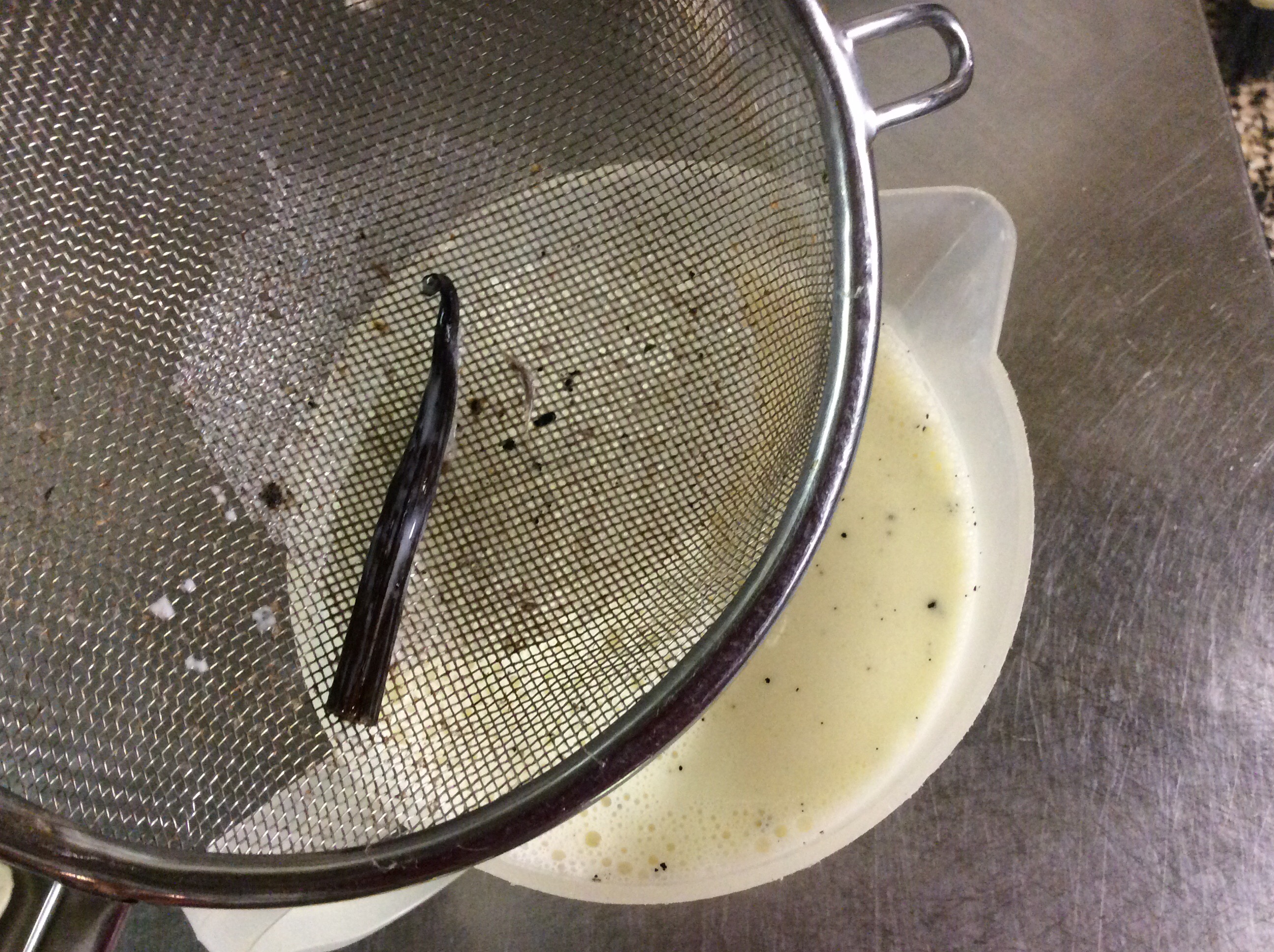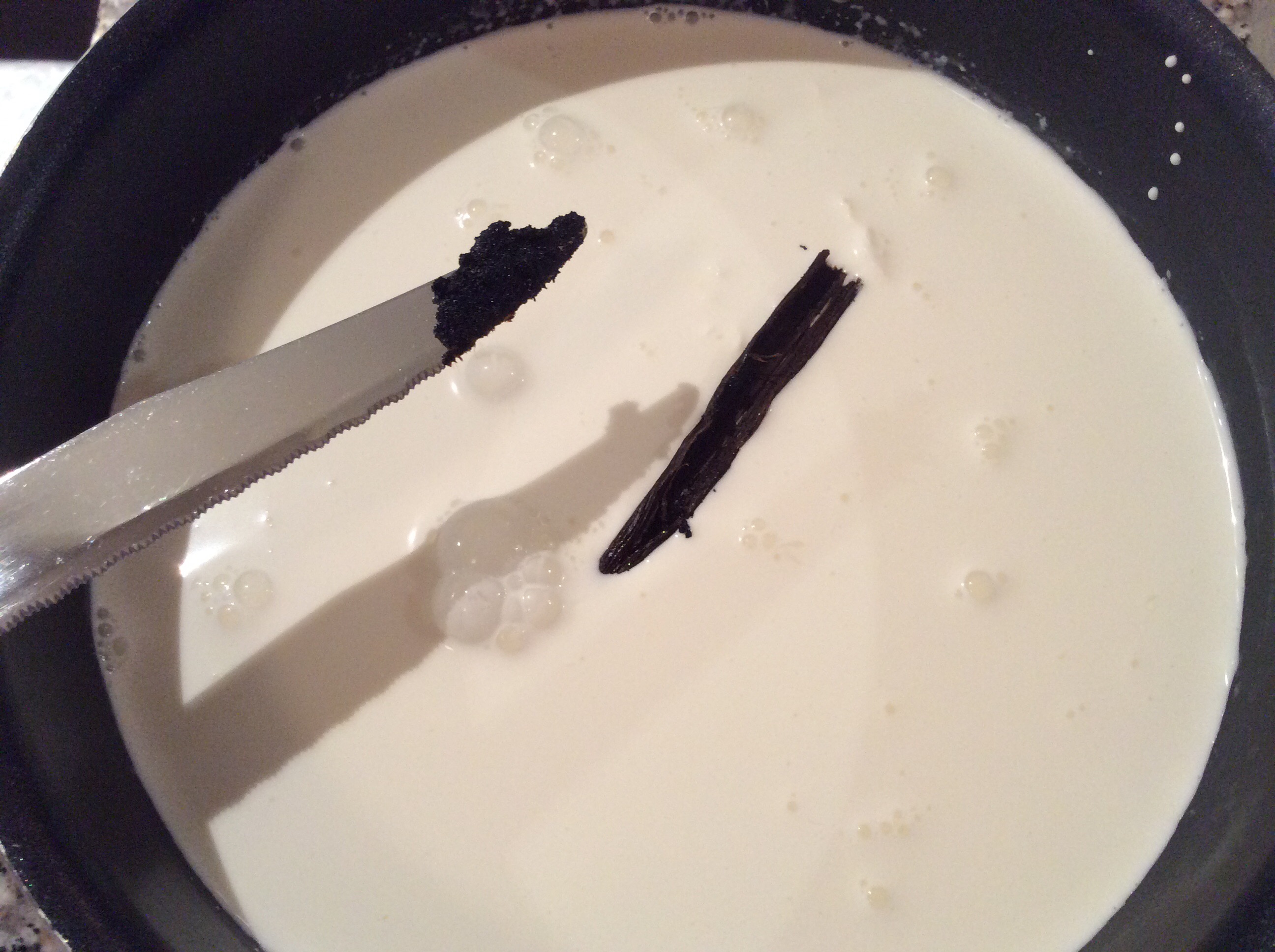 Taglio a metà la bacca di vaniglia ed estraggo i semi che aggiungo alla panna con la bacca