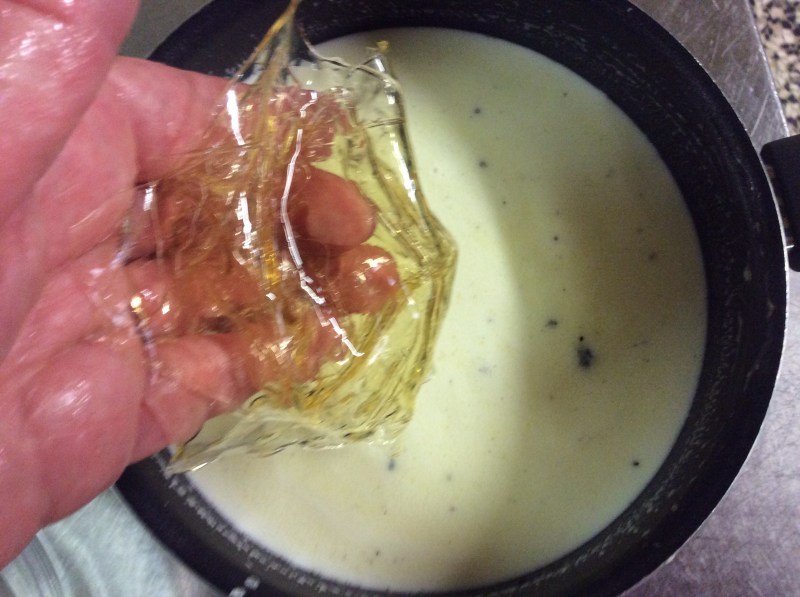 Porto il pentolino sul fuoco e attendo che arrivi a bollore, tolgo subito dal fuoco e aggiungo la gelatina ben strizzata