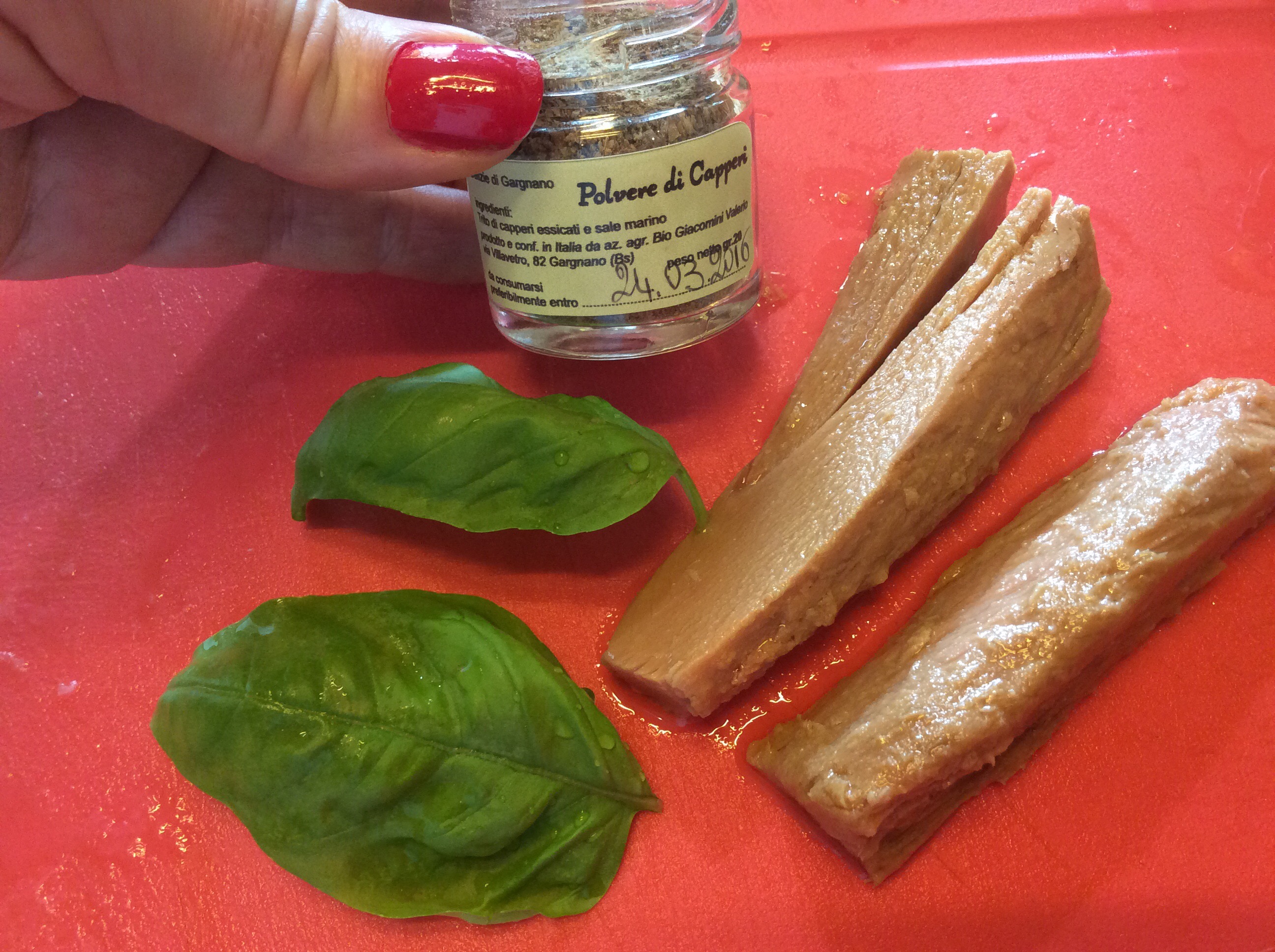 Scolo dall’olio il tonno e lavo 2/3 foglie di basilico, io ho della polvere di capperi dell’Azienda della mia amica Giacomini Marisa, in sostituzione potete tritare dei capperi