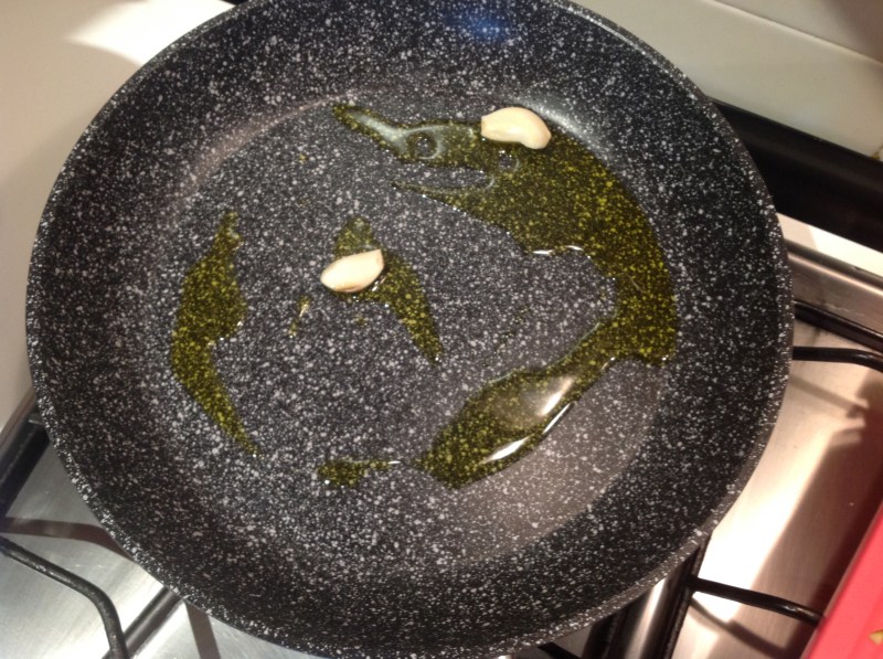 In una padella verso dell’olio piccante e uno spicchio di aglio