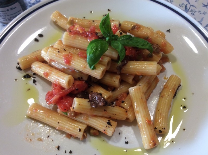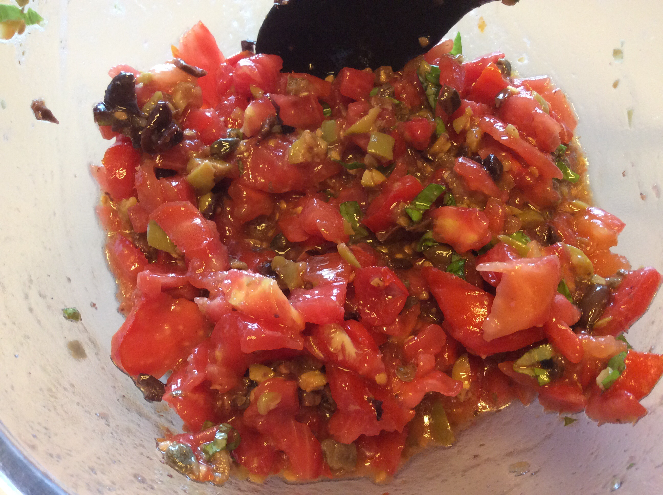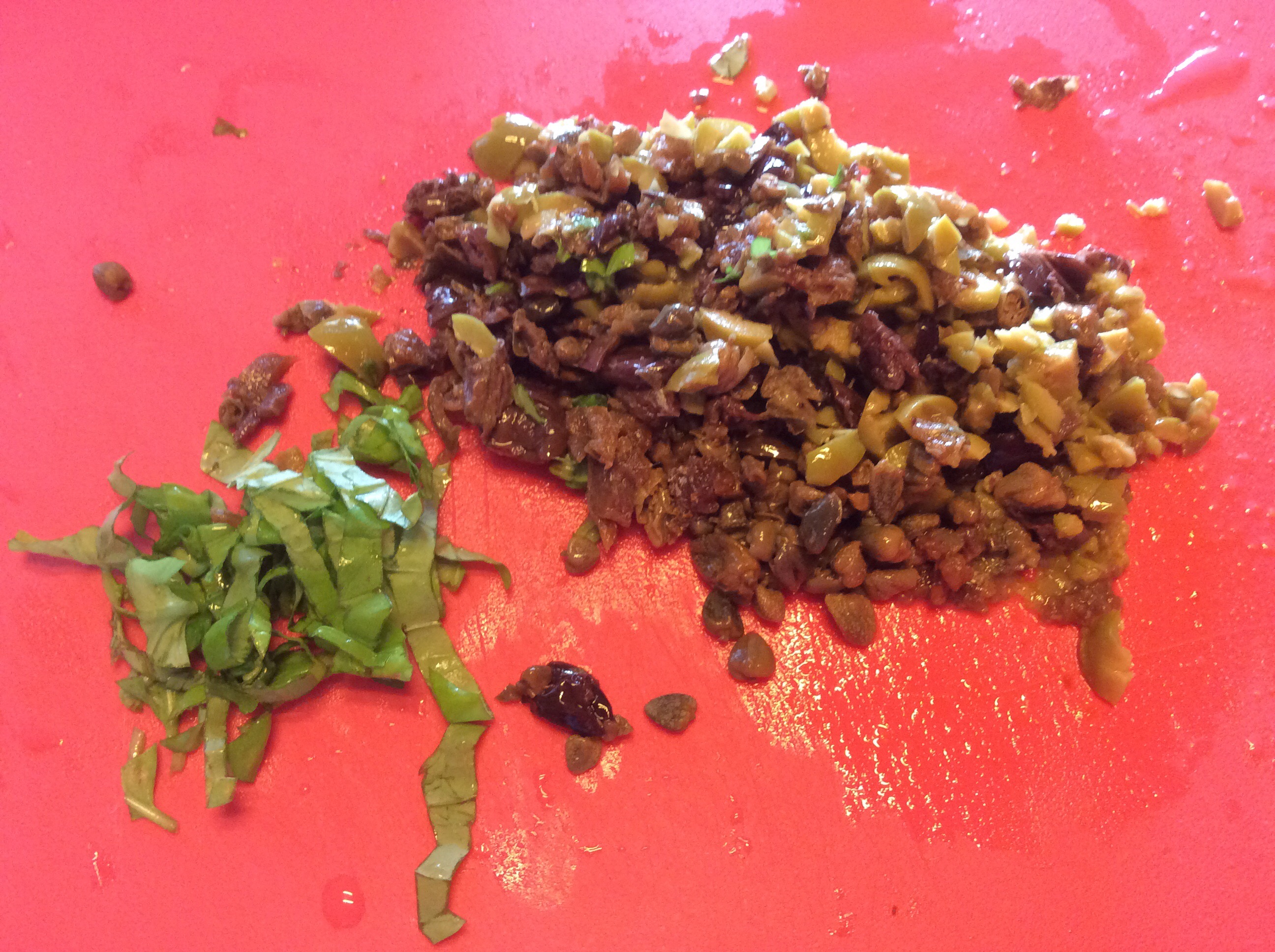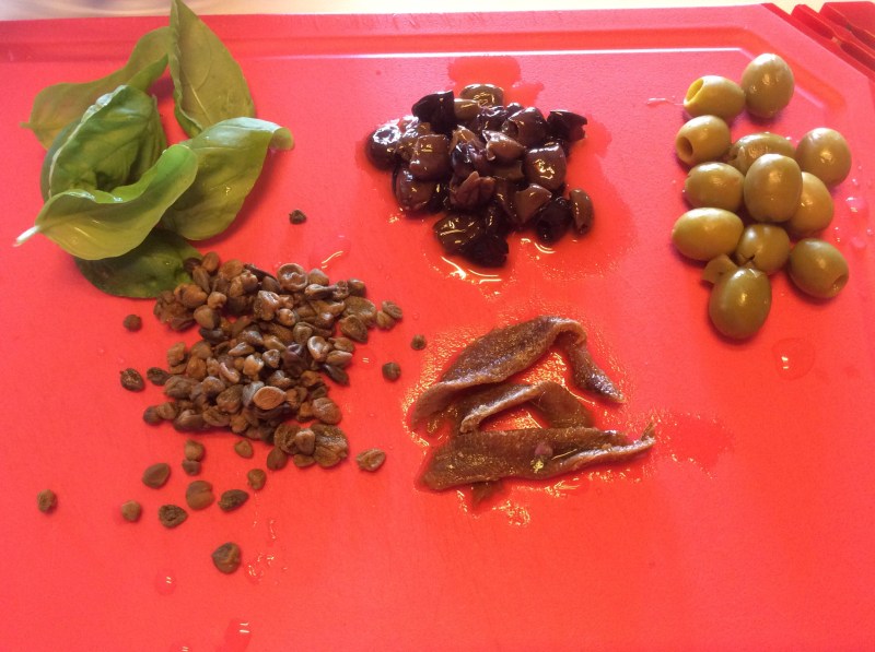 Lavo il basilico e lo metto sul tagliere con le olive, i capperi che ho dissalati e strizzati e le acciughe
