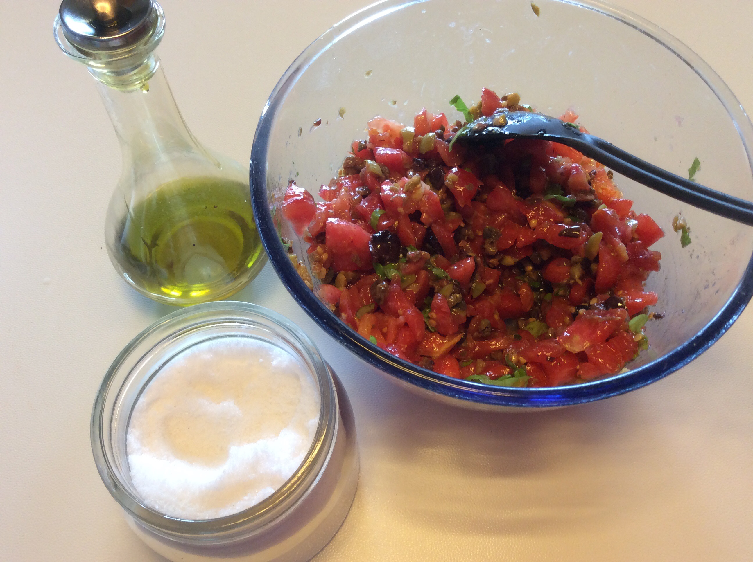 Lo metto in una ciotola regolando di sale e aaggiungendo abbondante olio extravergine di oliva