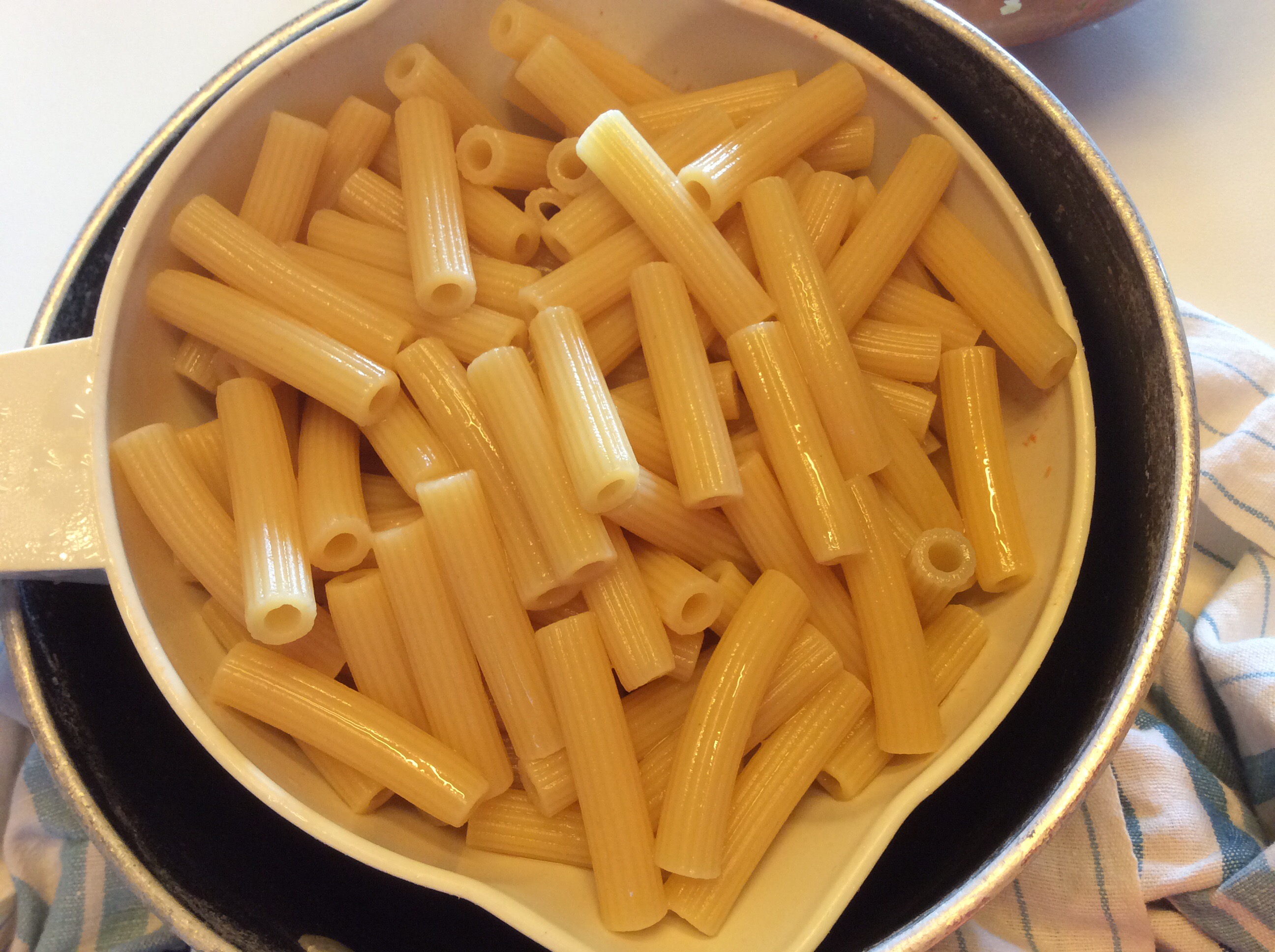 Cuocio la pasta al dente e la lascio raffreddare versando sopra un goccio di olio per non farla appiccicare