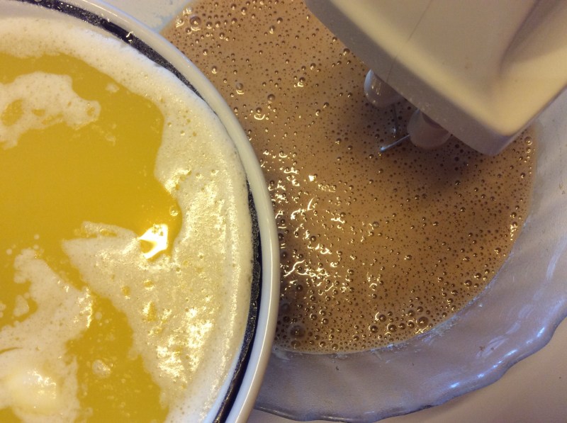 Quando il composto è ben montato aggiungo poco per volta il burro fuso freddo continuando a montare