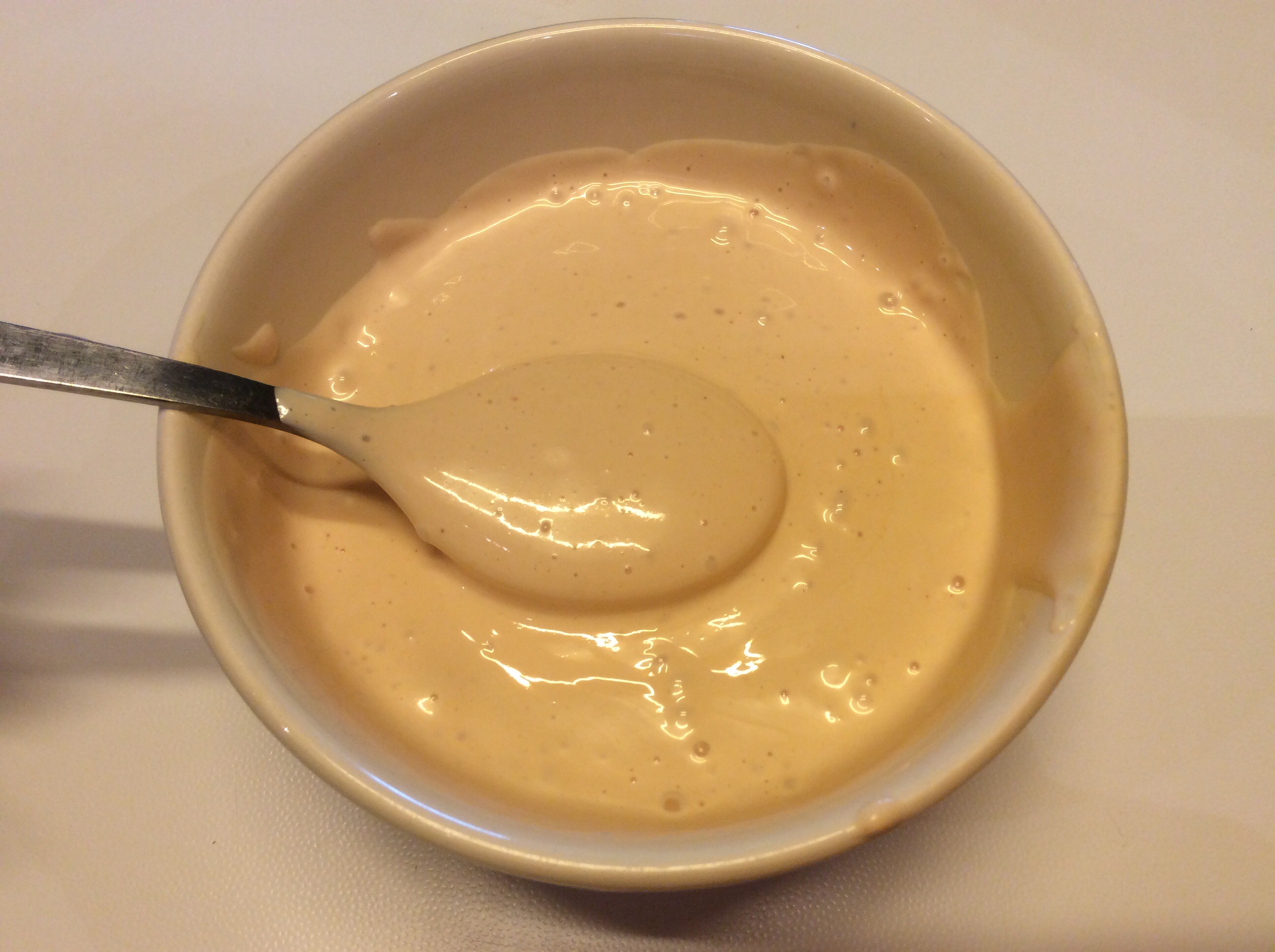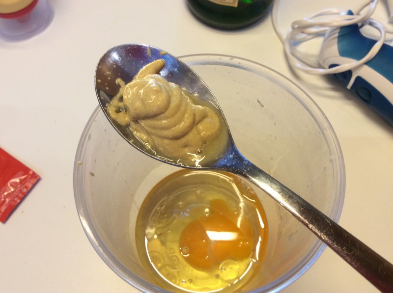 La maionese è pronta, in questo caso deve rimanere piuttosto fluida, la assaggio ed eventualmente regolo di sale