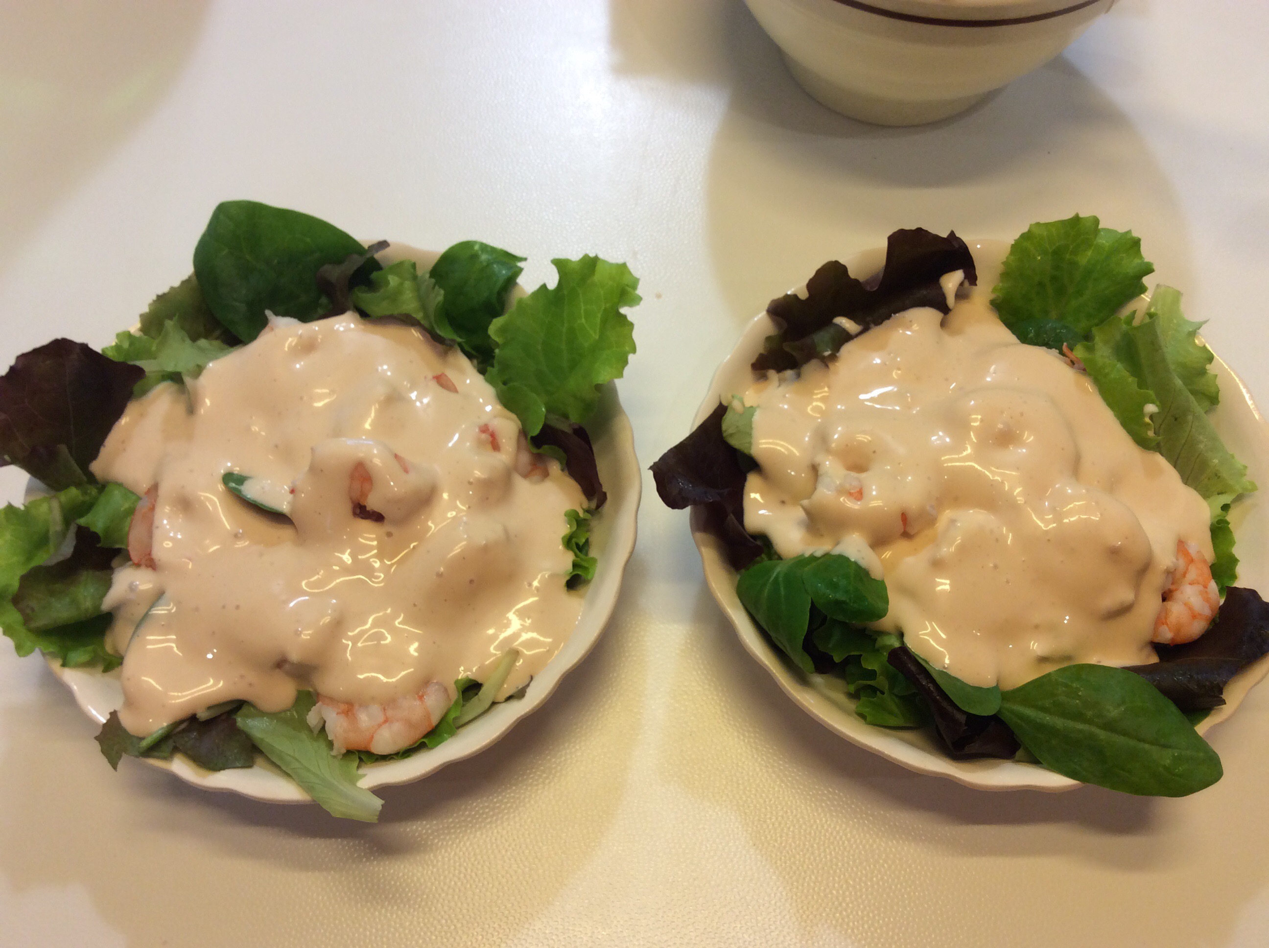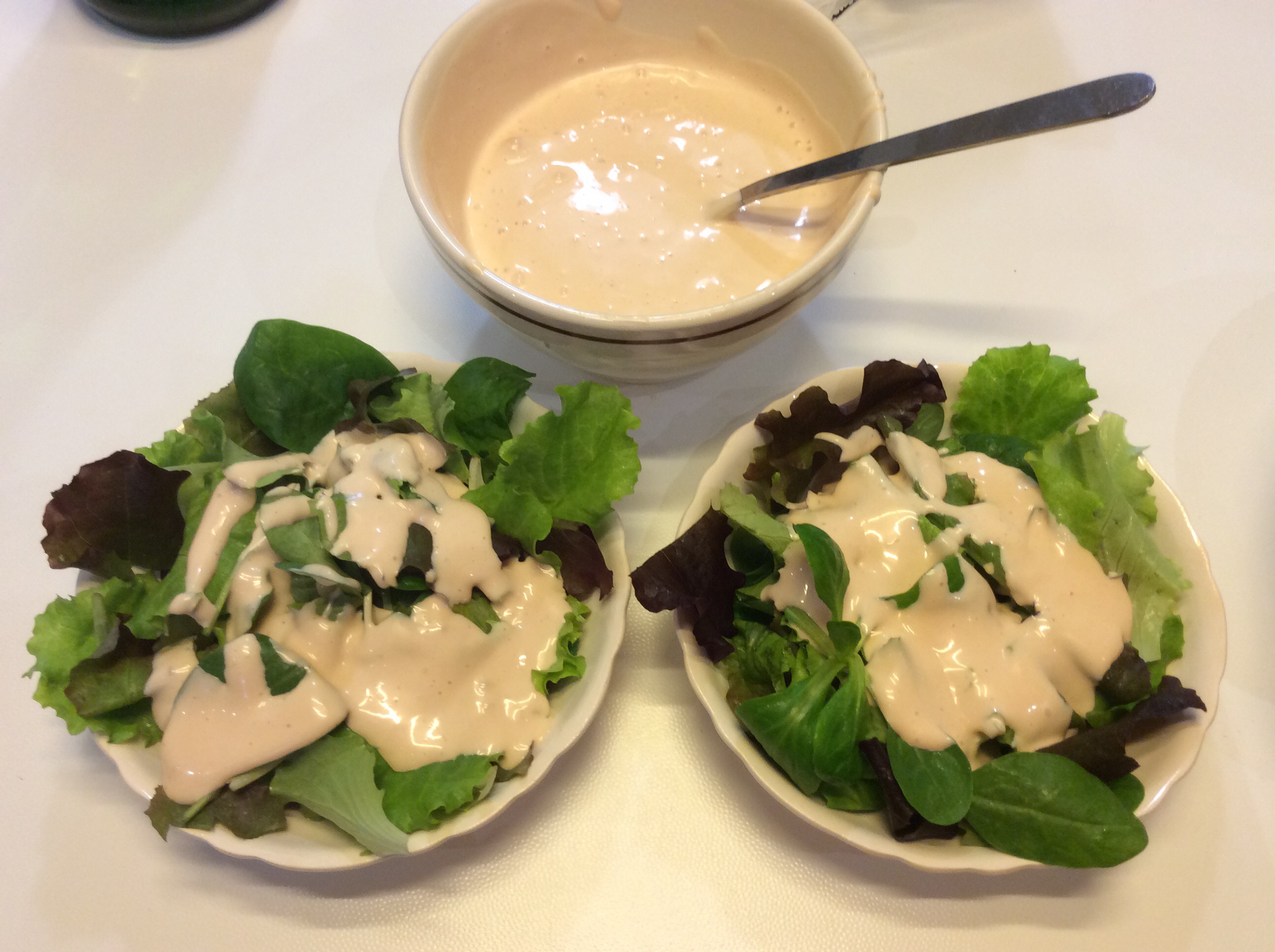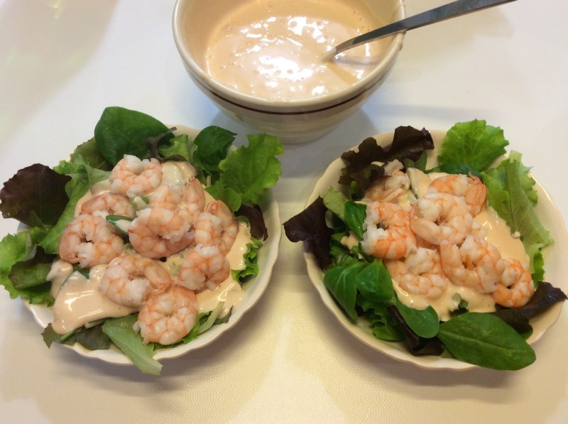 In due ciotoline dispongo sul fondo dell’insalina fresca e aggiungo un paio di cucchiai di salsa rosata
