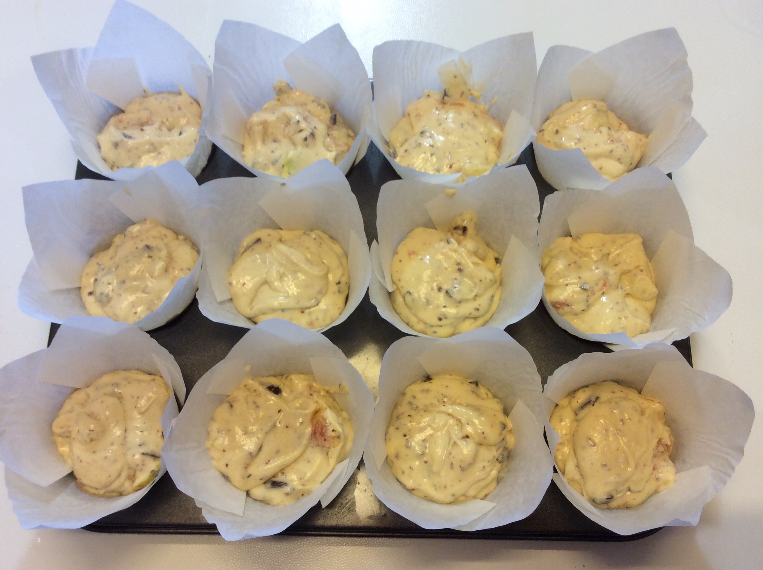 Dispongo i pirottini di carta nello stampo da muffin e suddivido il composto