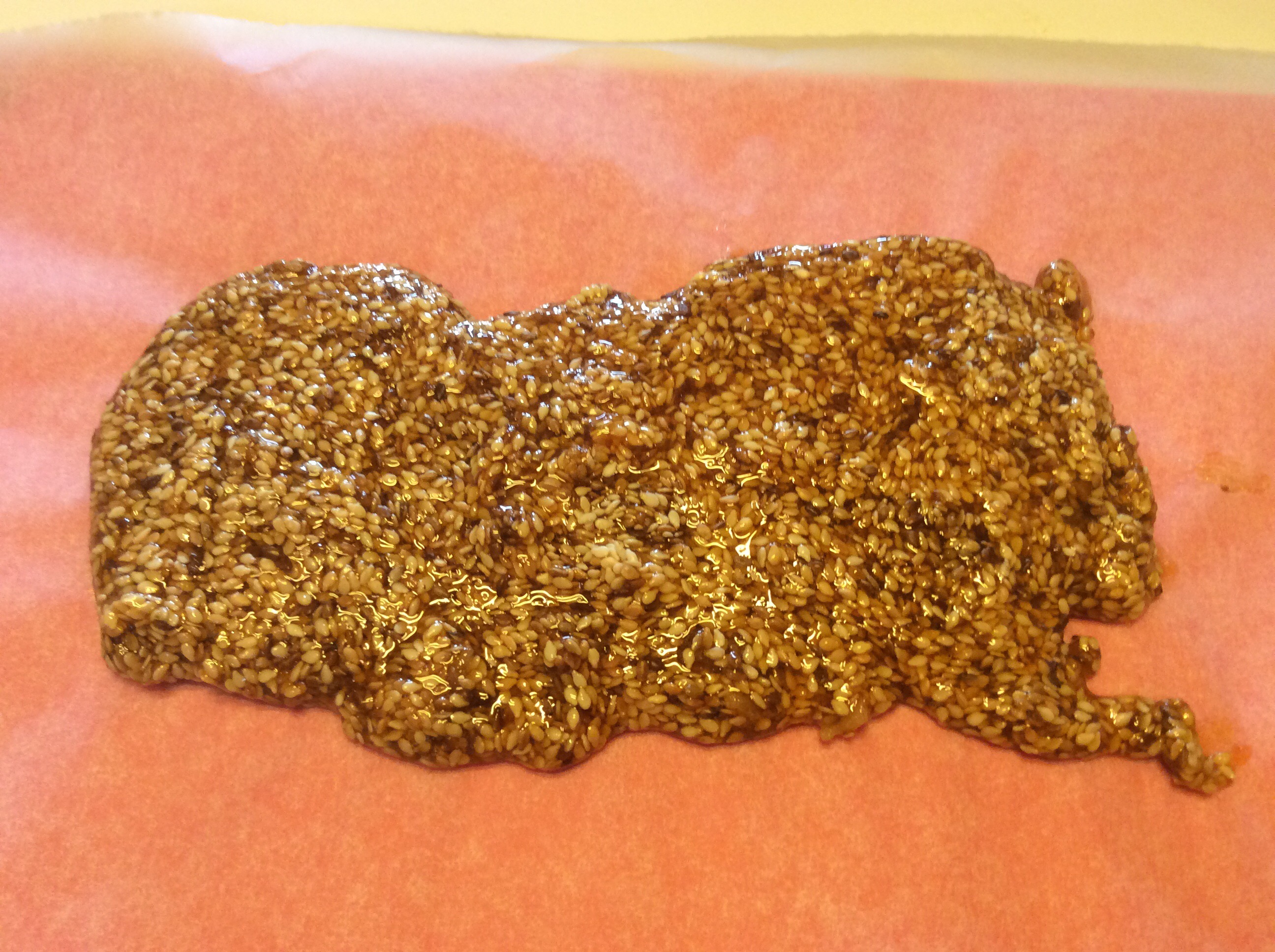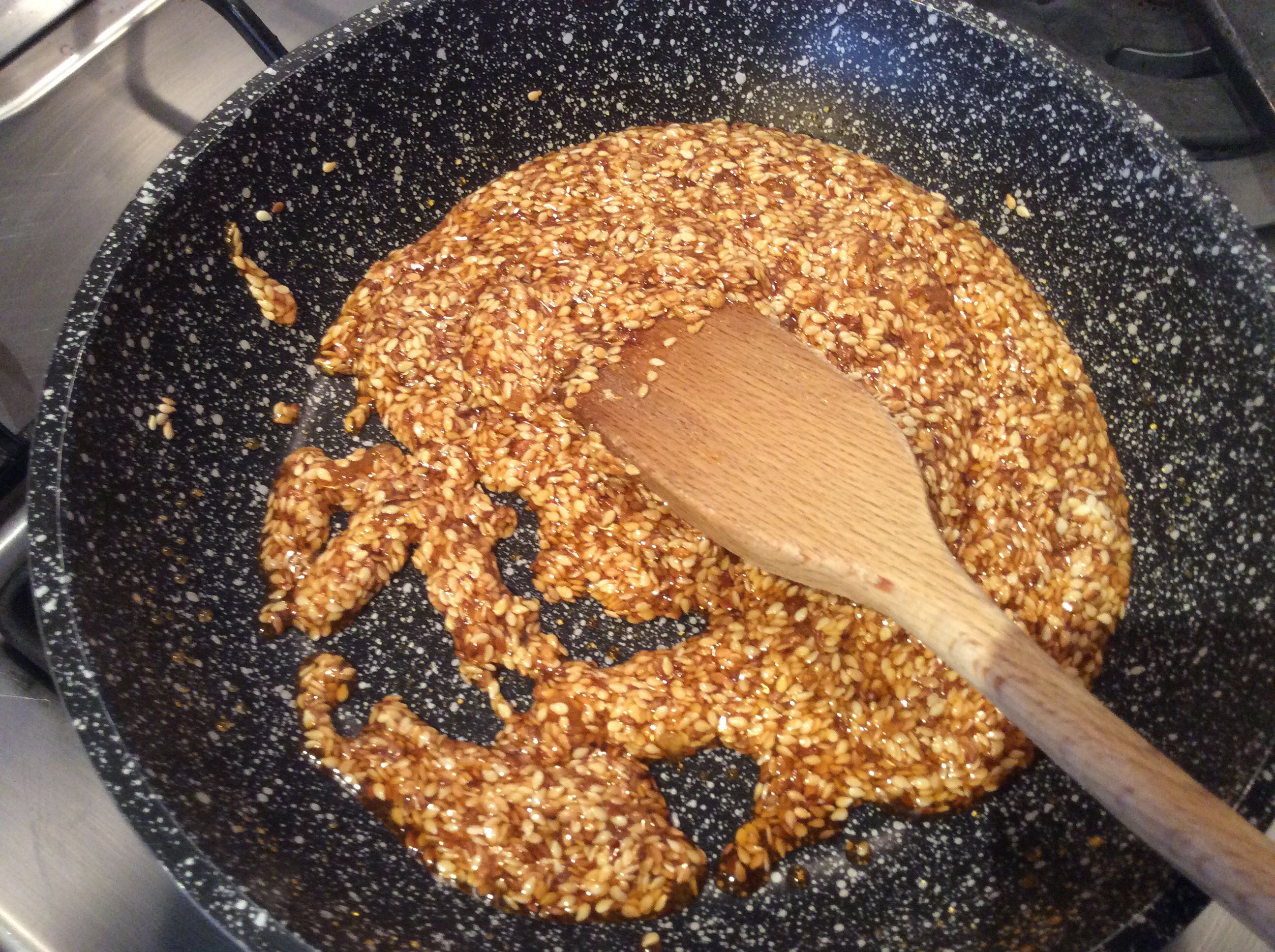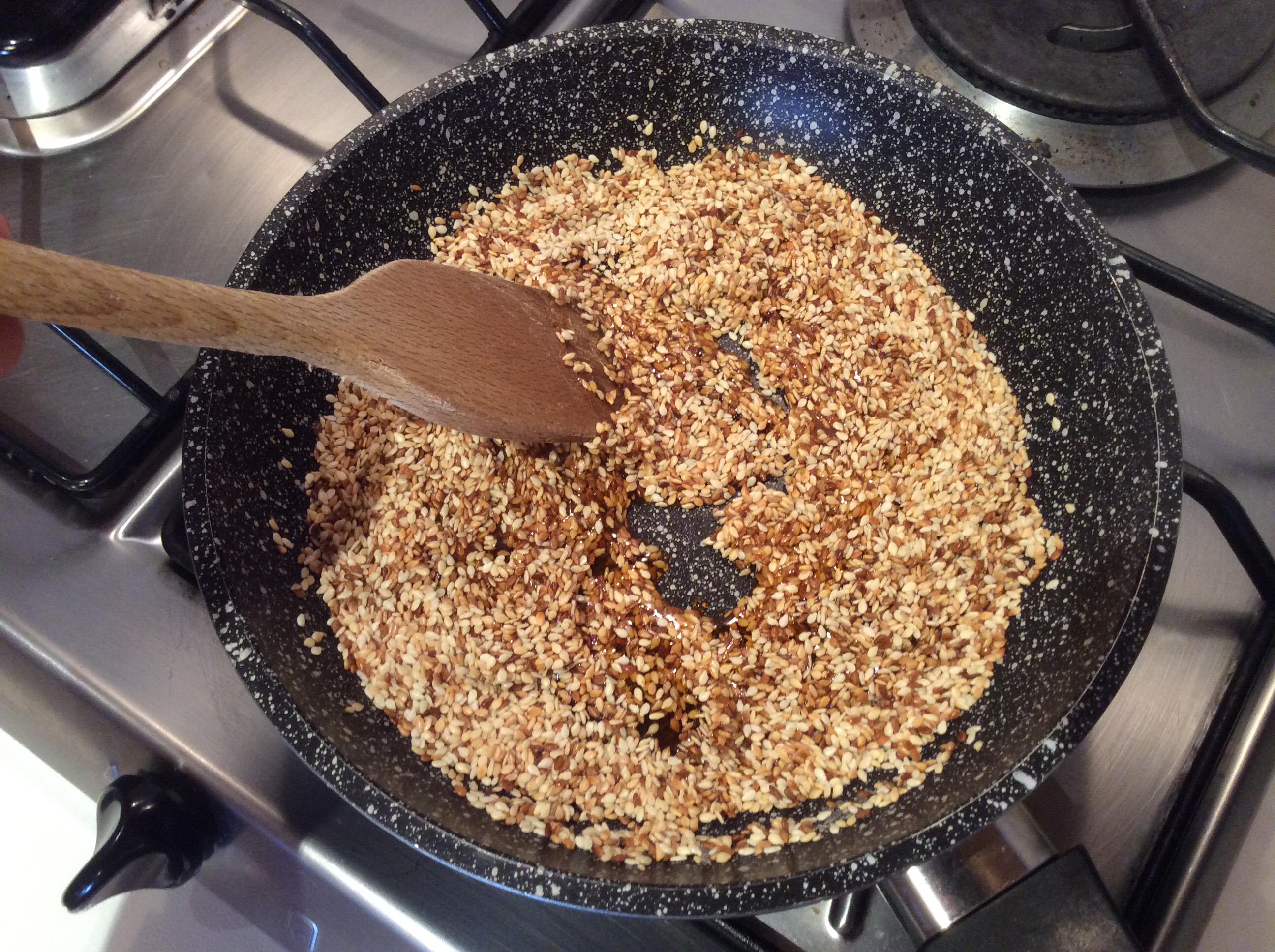 Preparo il croccante, faccendo  tostare il sesamo per alcuni minuti in un pentolino, poi lo tolgo e lo tengo da parte