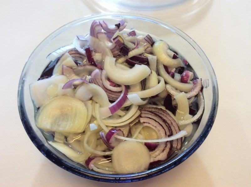 Prendo le cipolle, le ho sbucciate e tagliate dello spessore di un cm come per le patate