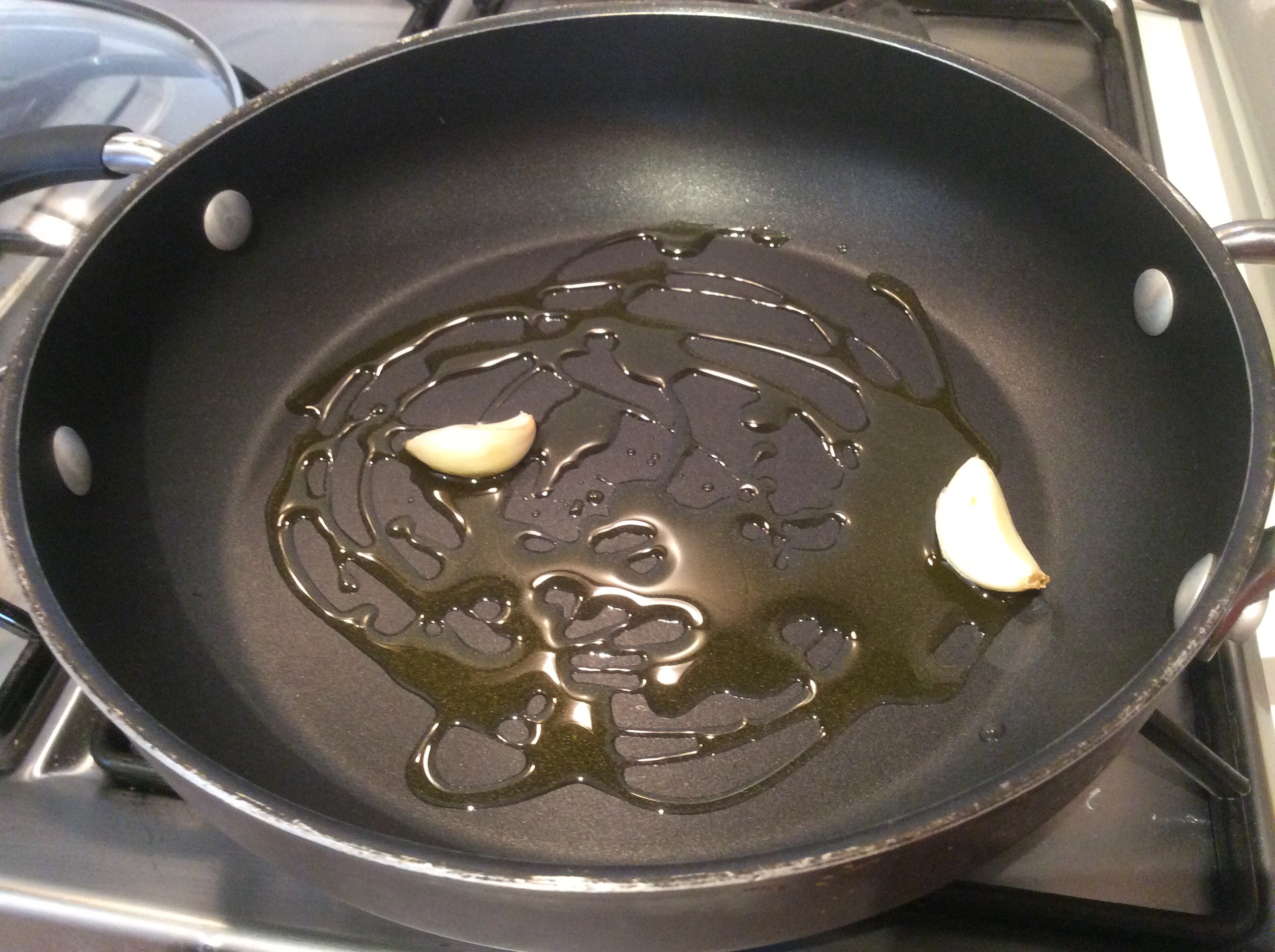 In una padella scaldo l’olio con lo spicchio di aglio