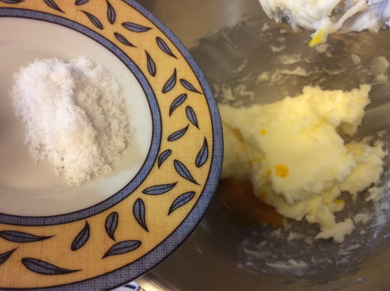 Unisco il sale, questa frolla avrà un gusto più salato delle solite, il contrasto è voluto, sta a voi poi modificarla o meno, se volete essere sicuri di non sentire i granelli di sale nell’impasto scioglietelo in un cucchiaio di acqua prima di aggiungerlo all’impasto