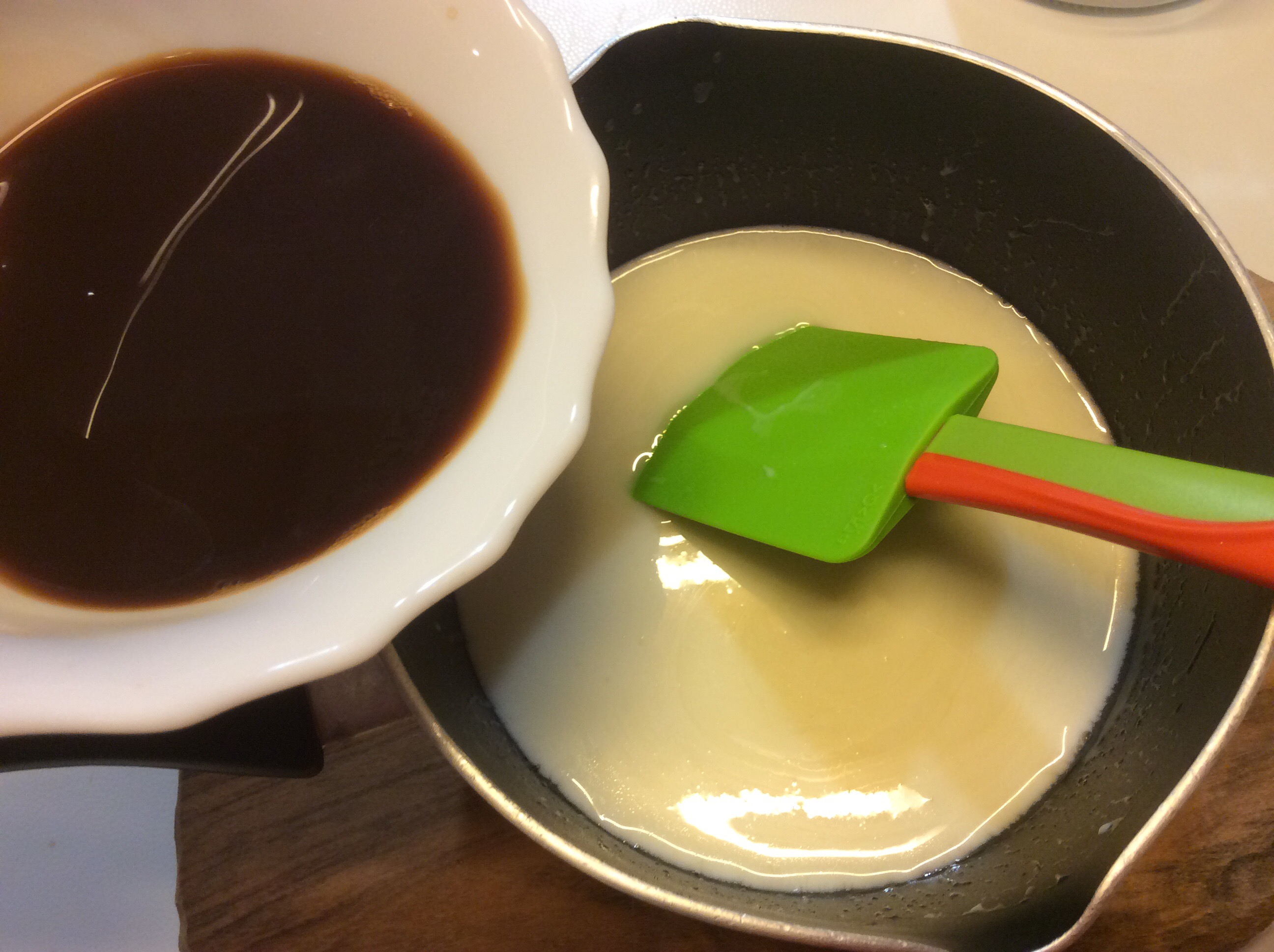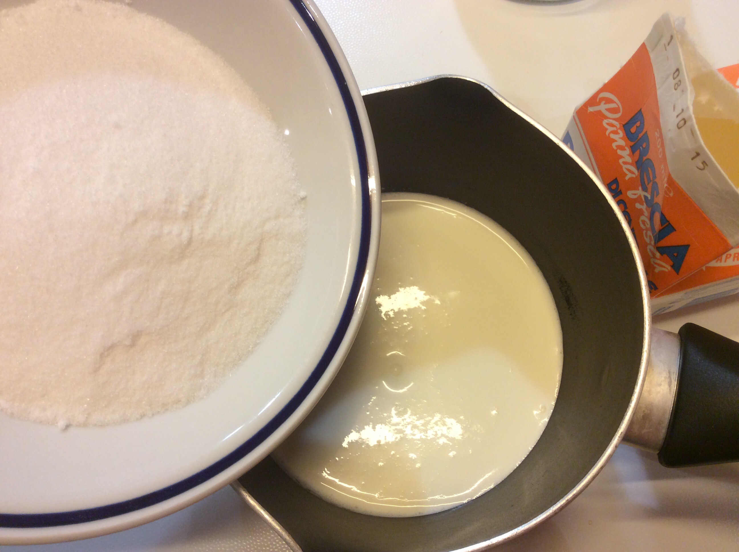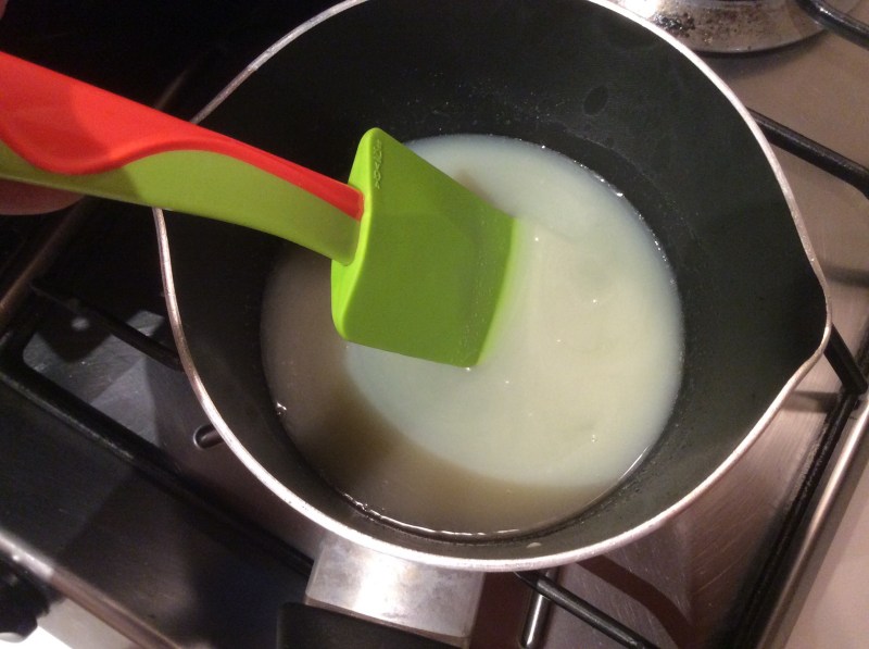 Scaldo senza far bollire mescolando finché lo zucchero é sciolto, tolgo dal fuoco