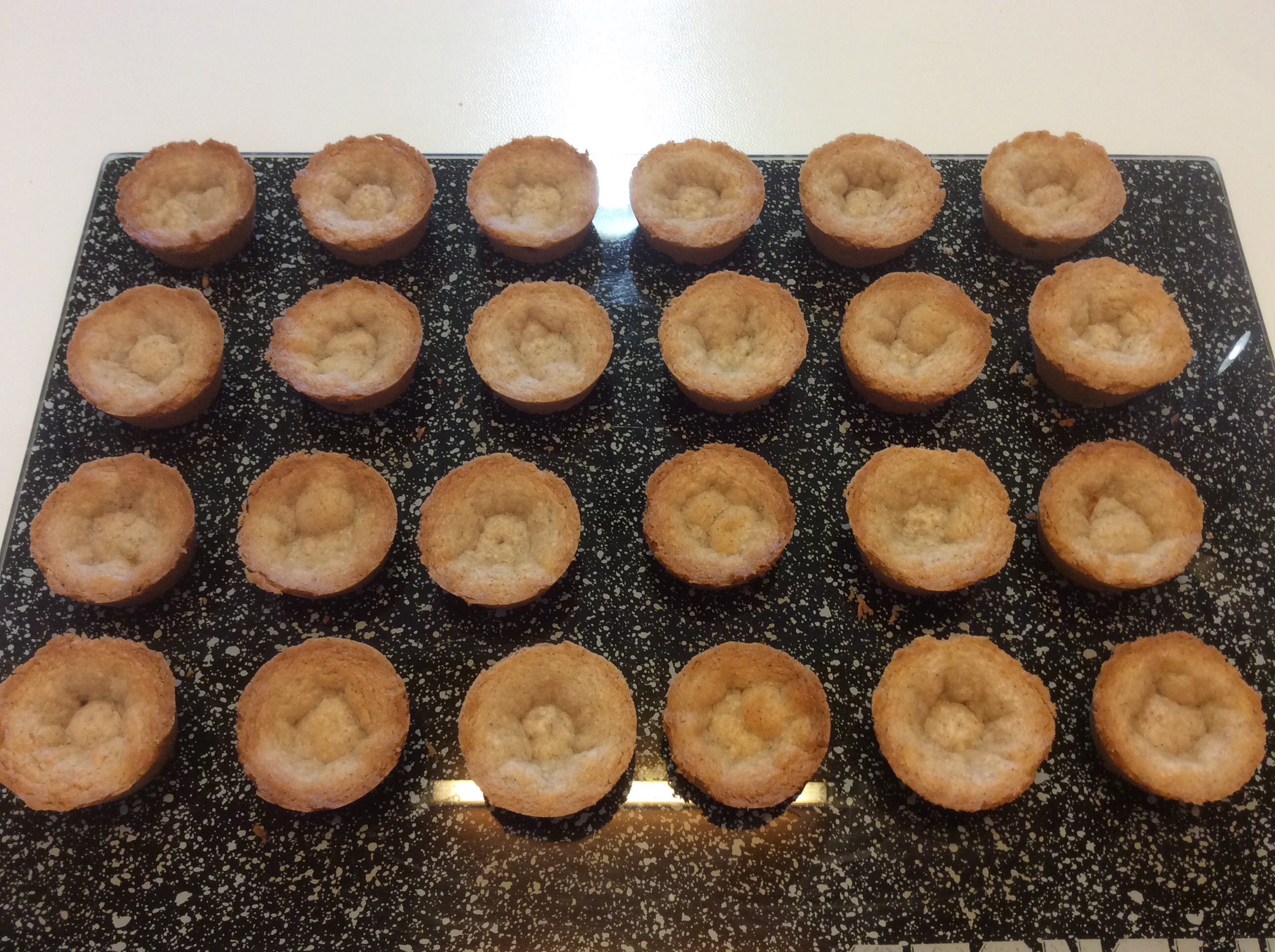 Con questa dose sono venute 24 mini tartellette, con il resto ho preparato dei biscottini stendendo l’impasto, inforno per 3/4 minuti poi l’ho tolto e coppato infornato nuovamente fino a cottura, coppandolo da crudo in cottura non mantiene la forma e si deforma
