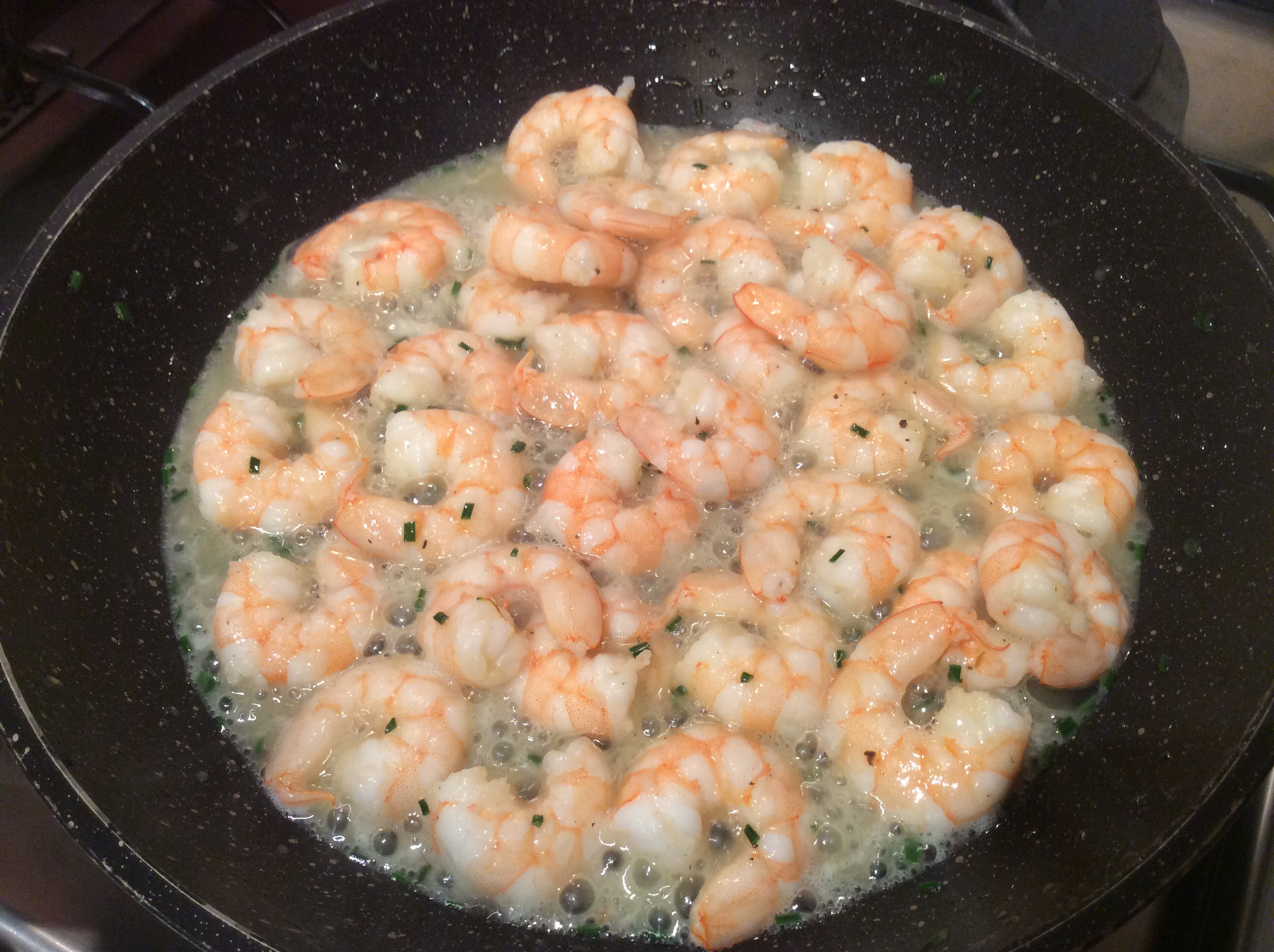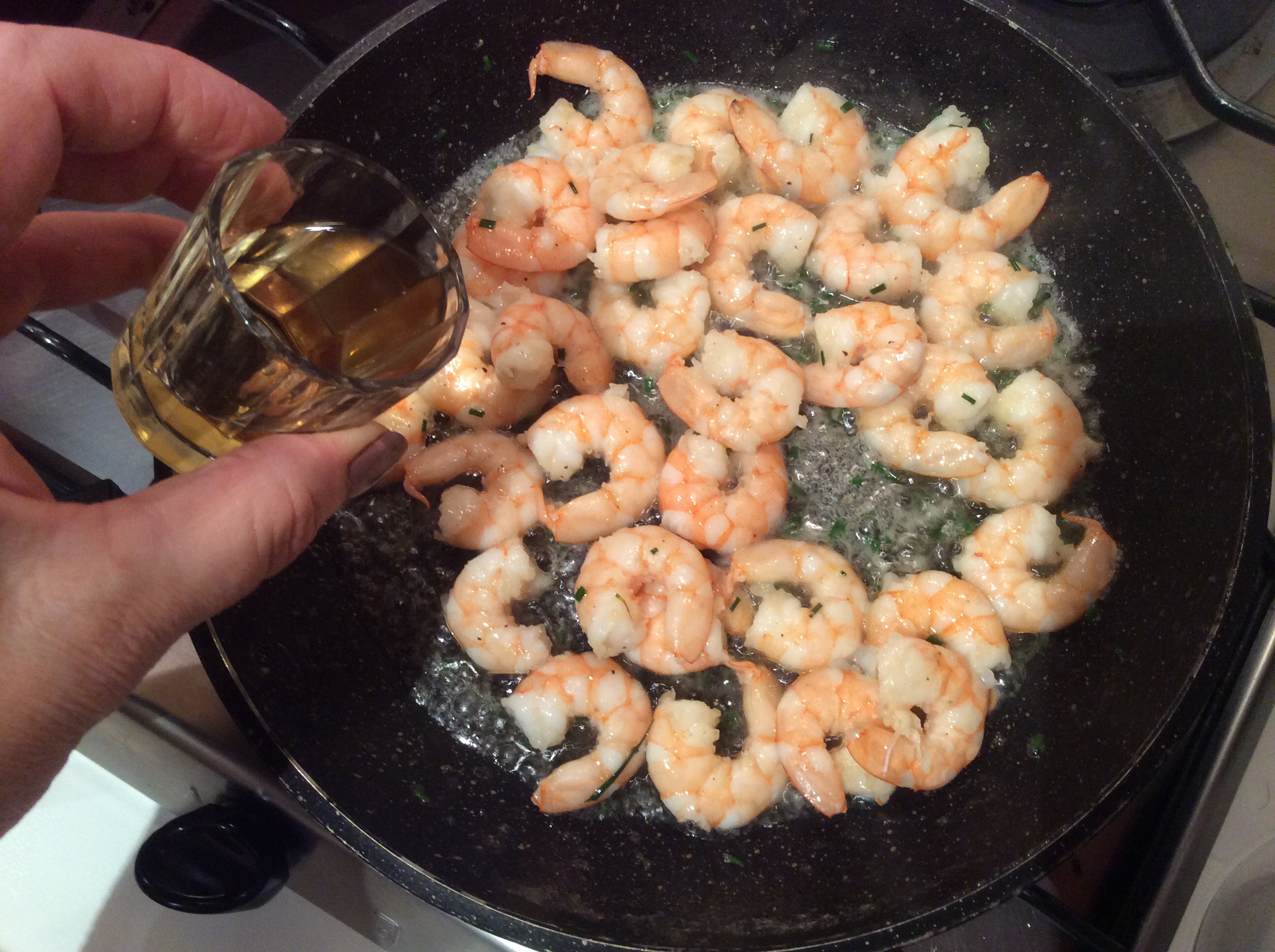 In una padella metto un bel pezzo di burro lo lascio sciogliere e aggiungo le code, aggiungo sale, pepe, erba cipollina, sfumo con il Martini, li rosolo alcuni minuti