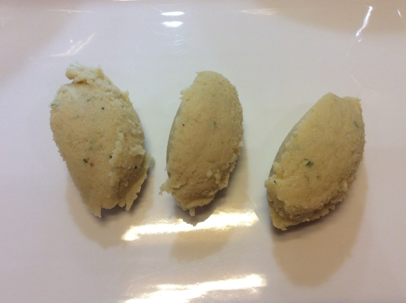 Qundo devo impiattare, scaldo la purea nel microonde, poi con due cucchiai formo le quenelle