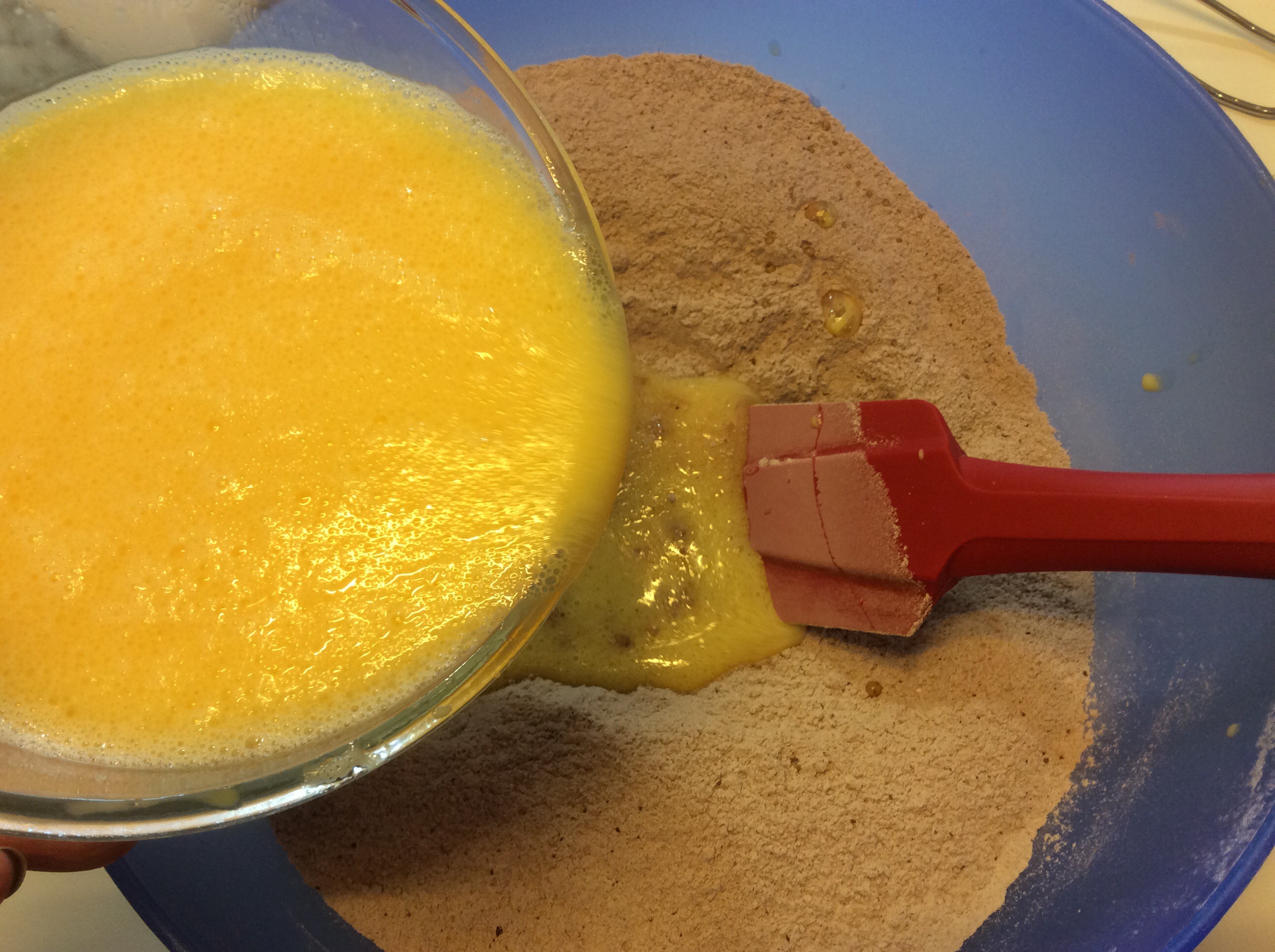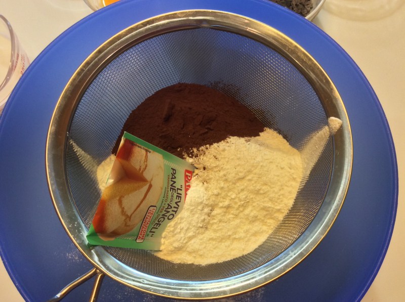 Setaccio in una ciotola farina, cacao e lievito, preriscaldate il forno perché l’impasto è velocissimo da realizzare