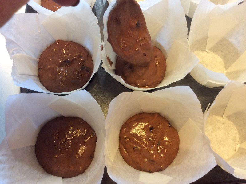 Sistemo i pirottini di carta in uno stampo da muffin e distribuisco il composto servendomi di due cucchiai, potete adoperare un sac a poche