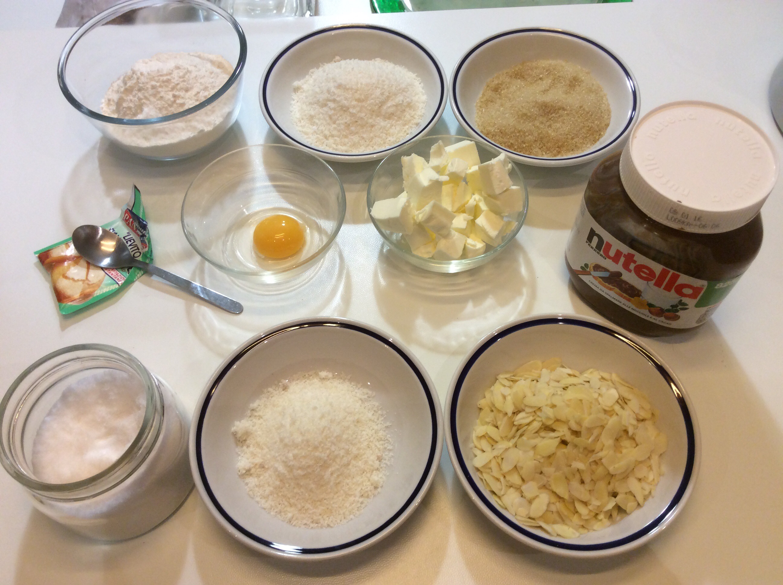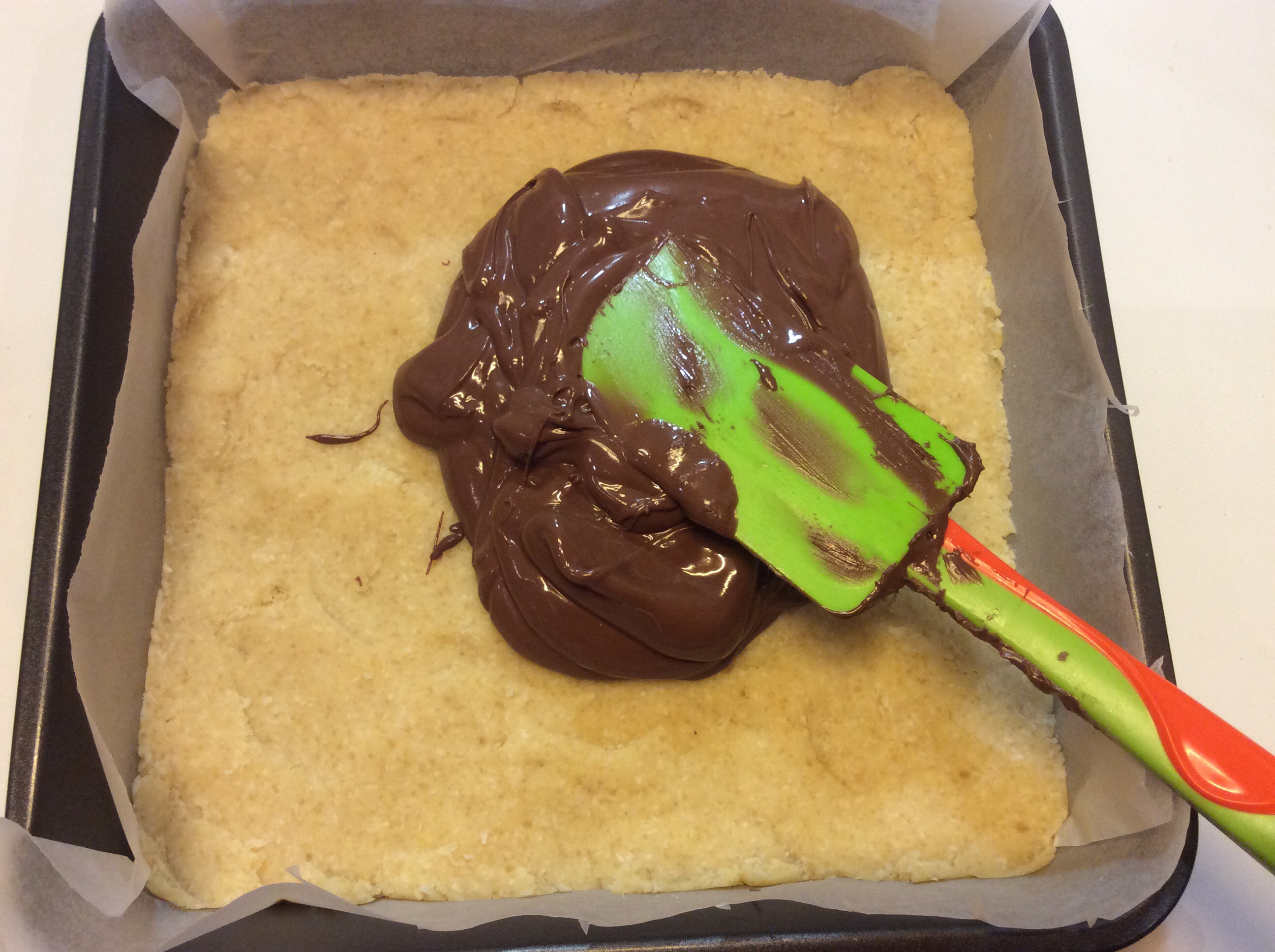 Sciolgo a bagnomaria o a microonde per pochi minuti la Nutella per facilitarmi a stenderla e la distribuisco sul fondo