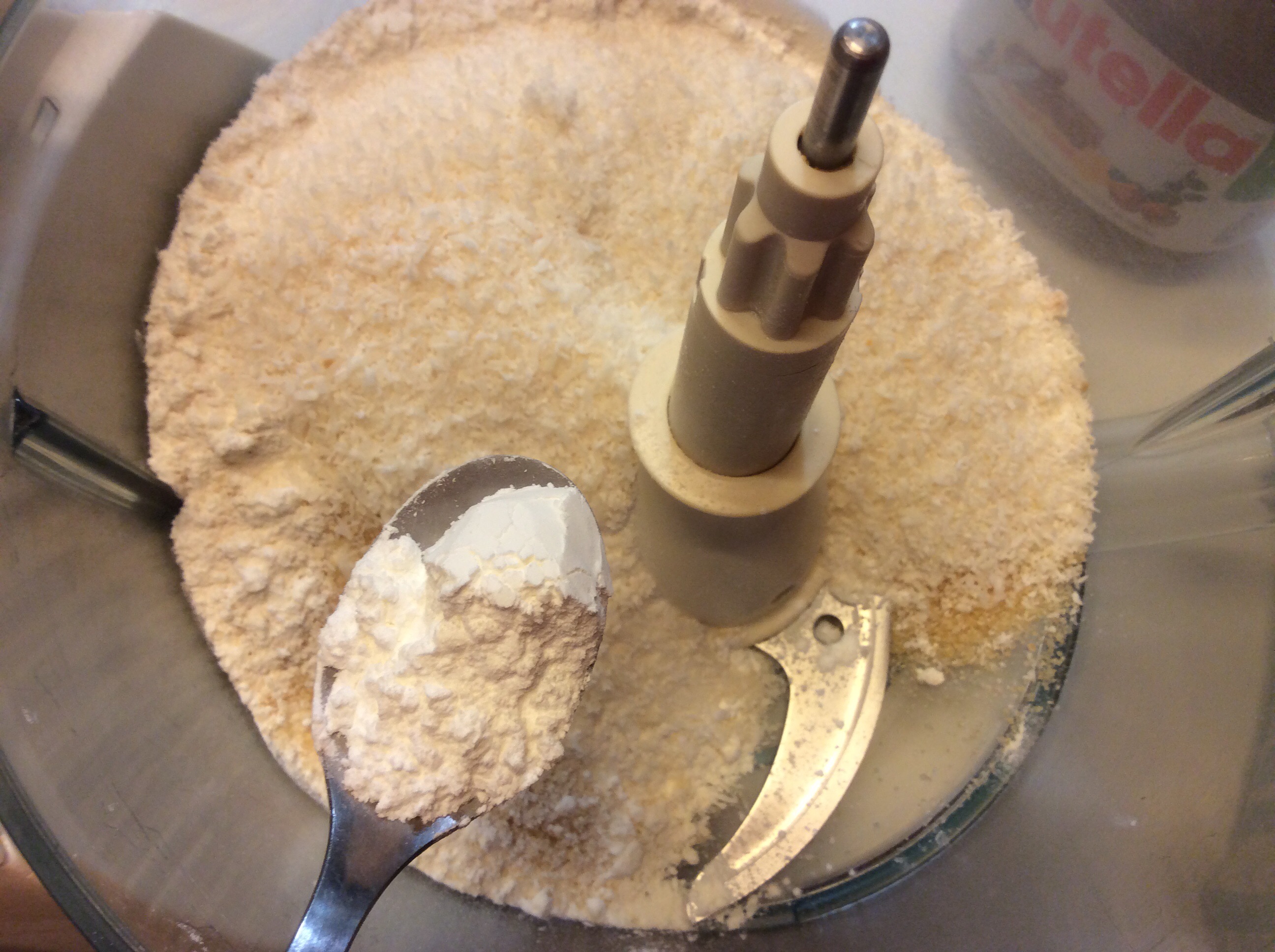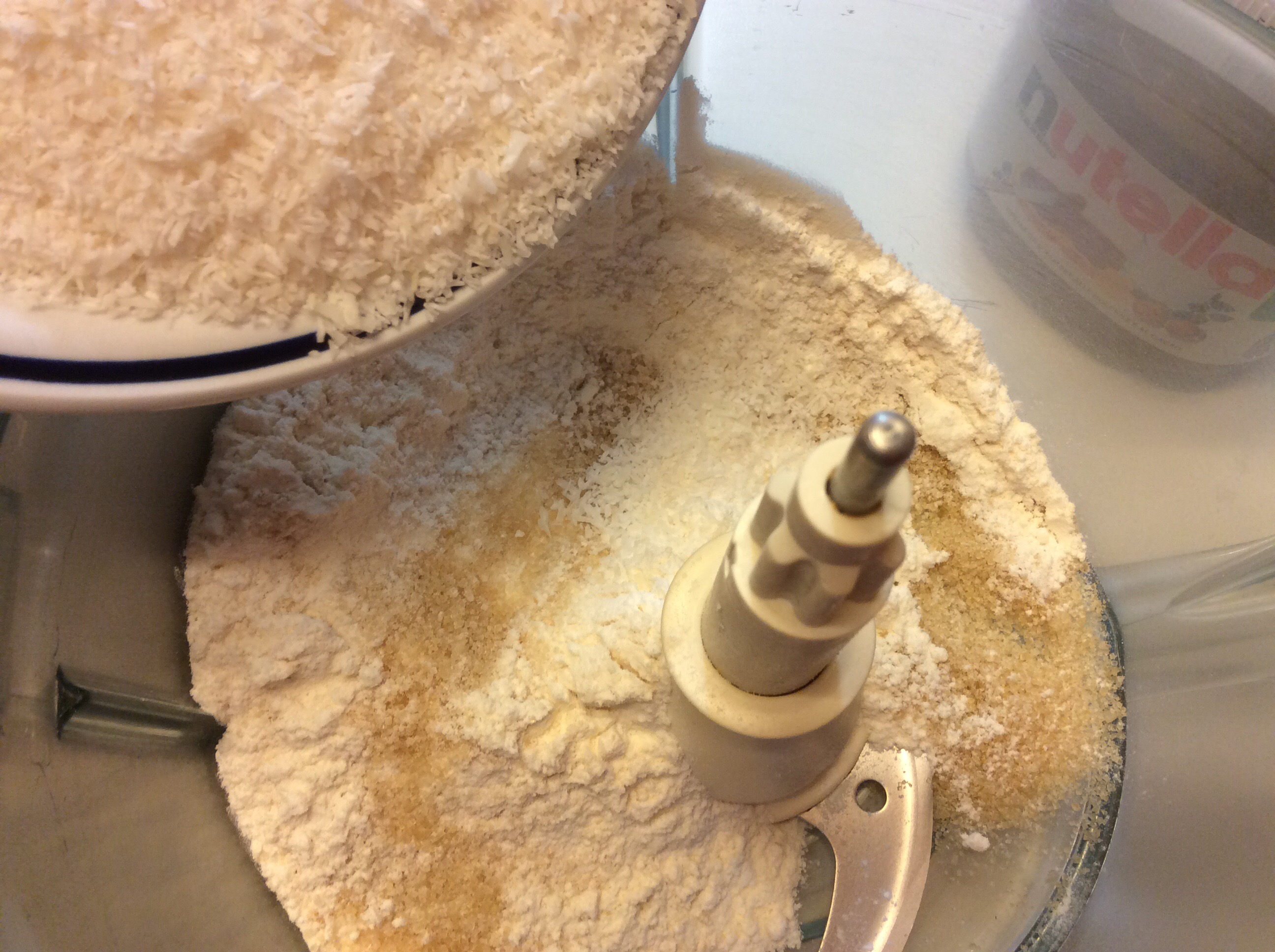 Nel mixer verso la farina, lo zucchero di canna, il cocco
