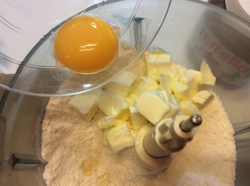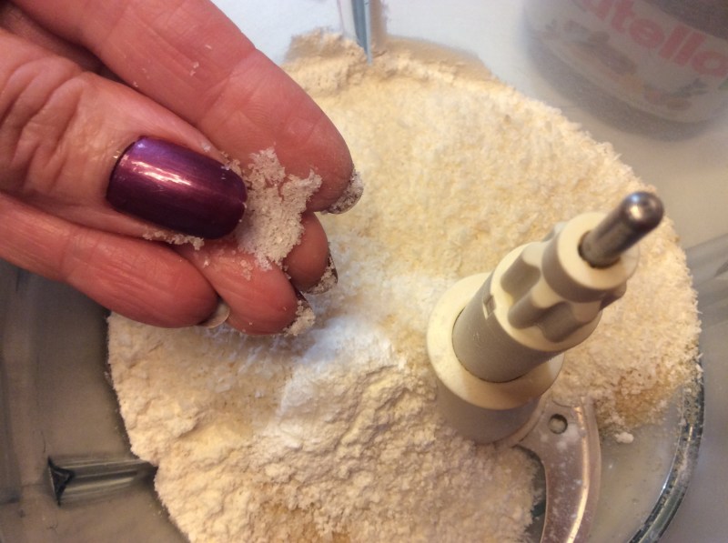 Aziono il mixer e lavoro il tempo di ottenere delle briciole, le verso sul piano di lavoro impasto brevemente e ottengo un impasto omogeneo senza lavorarlo troppo, poi divido l’impasto in due parti uguali