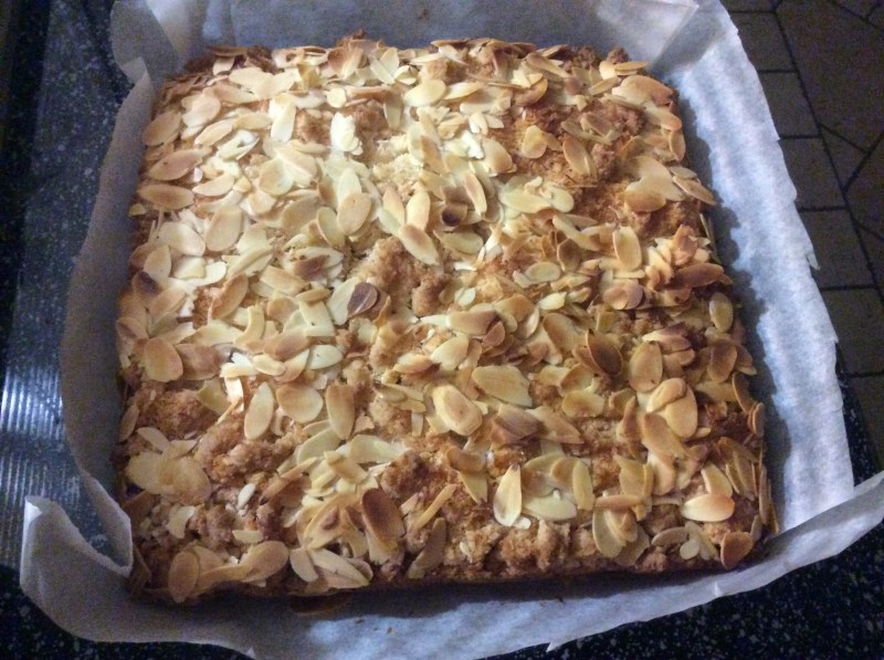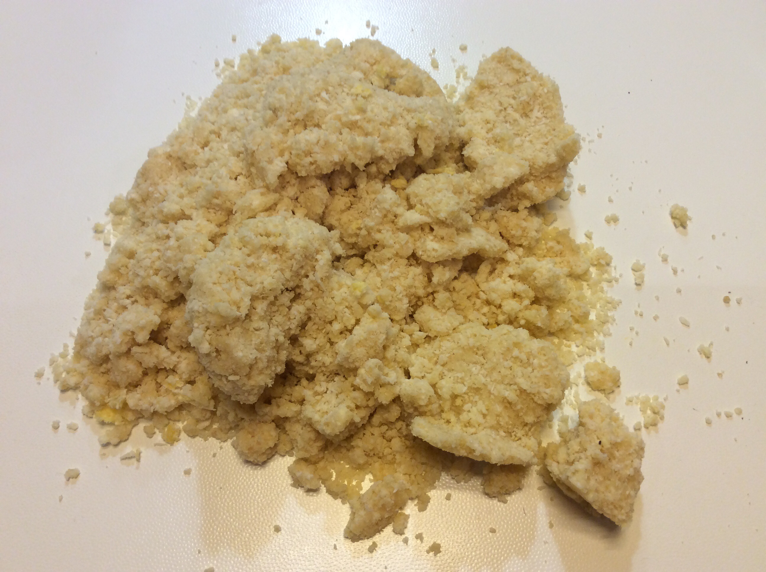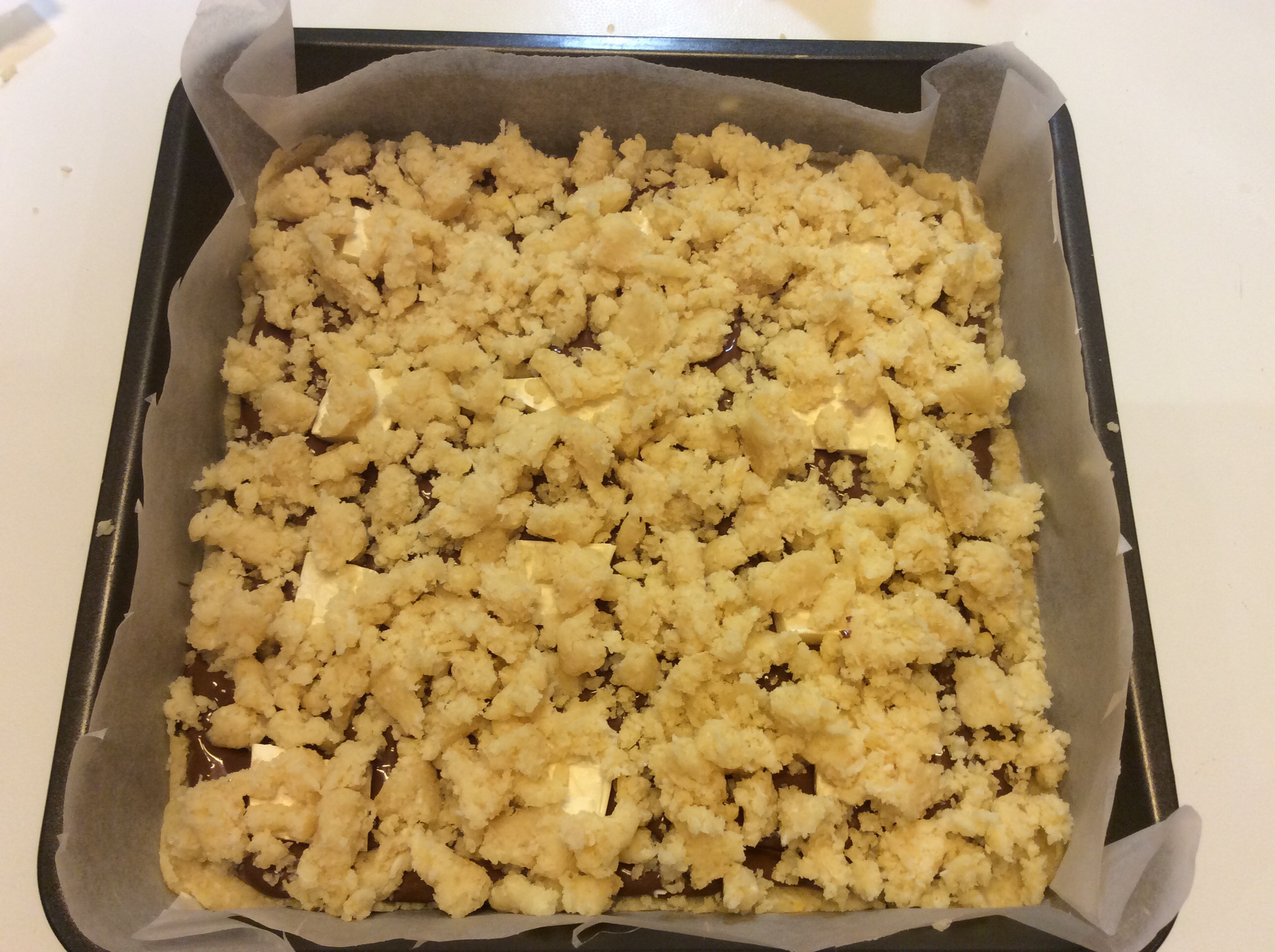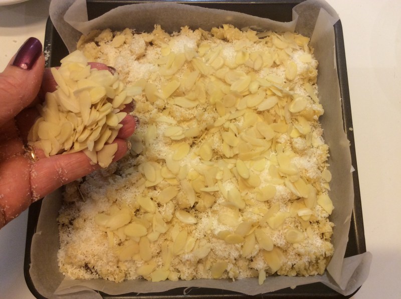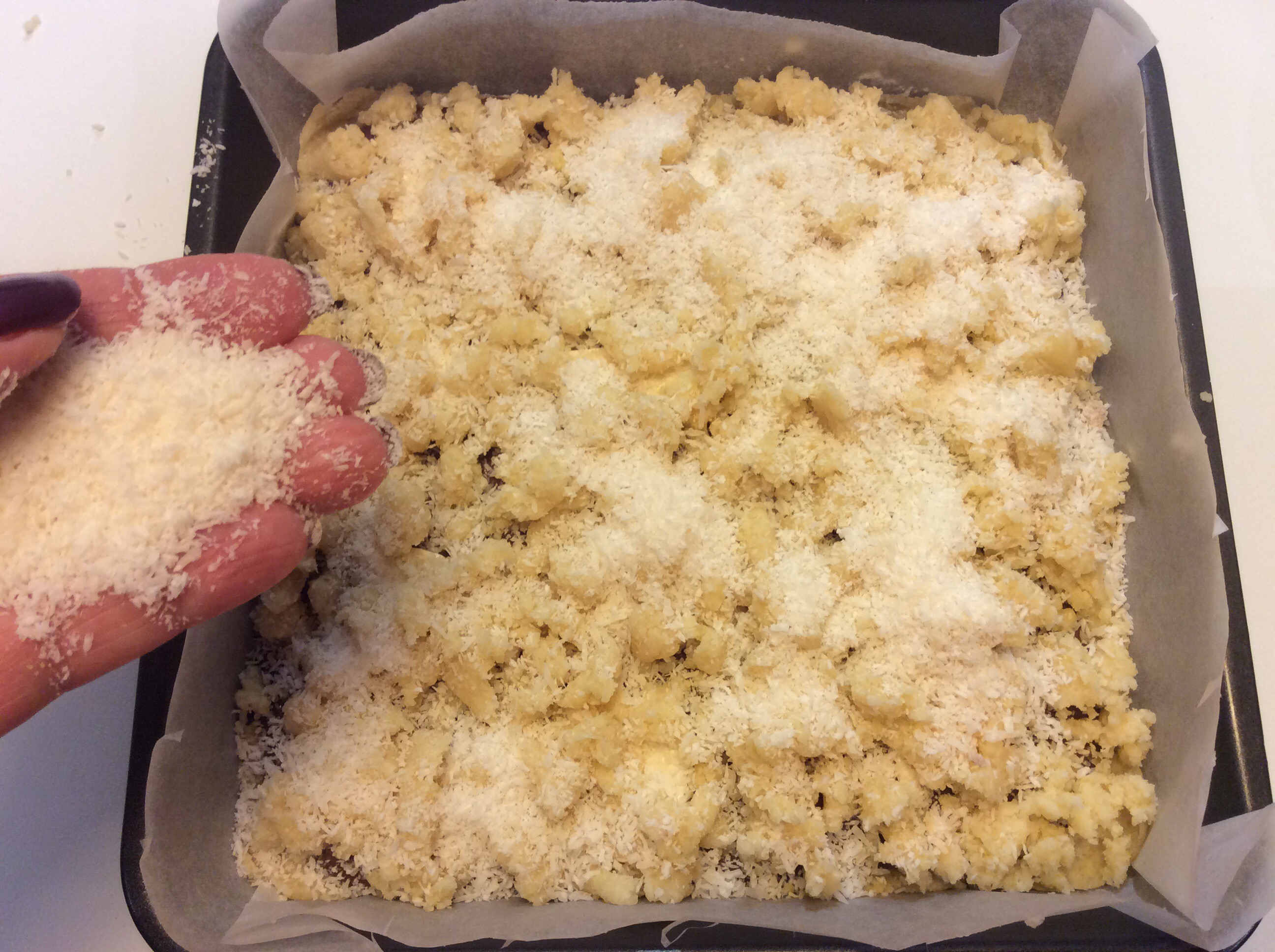 Prendo l’altra metà dell’impasto e lo sbriciolo su tutta la superficie cercando di distribuirla in modo uniforme