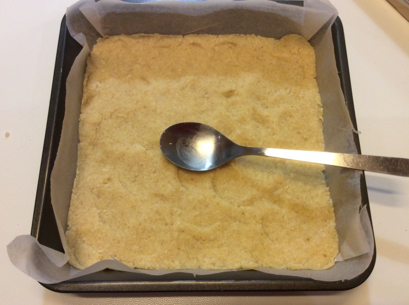 Rivesto una tortiera quadrata 20 x 20 con carta forno e distribuisco metà dell’impasto e lo appiattisco con le mani e poi aiutandomi con un cucchiaio