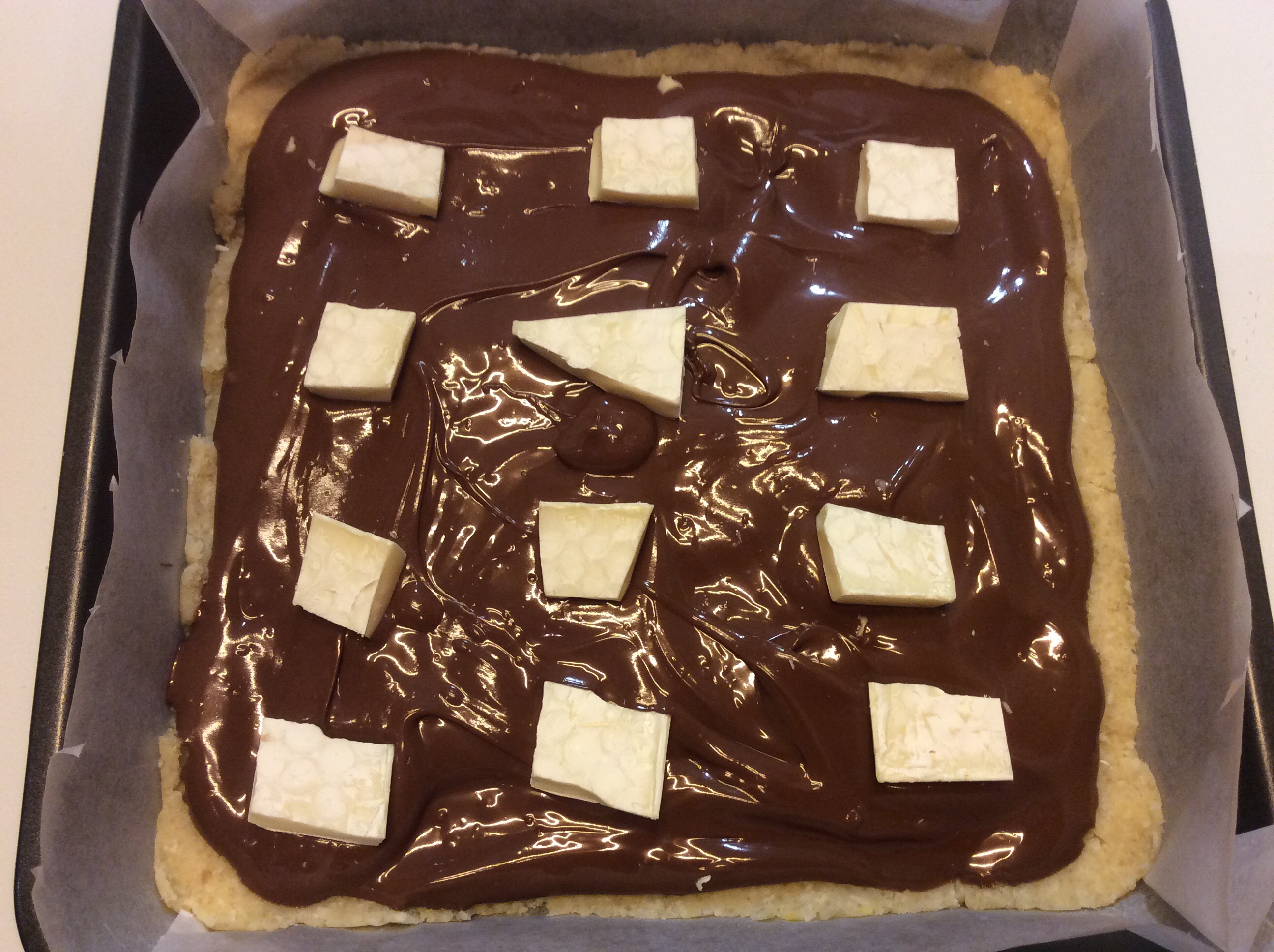 Spezzetto il cioccolato a quadretti e li distribuisco sulla Nutella