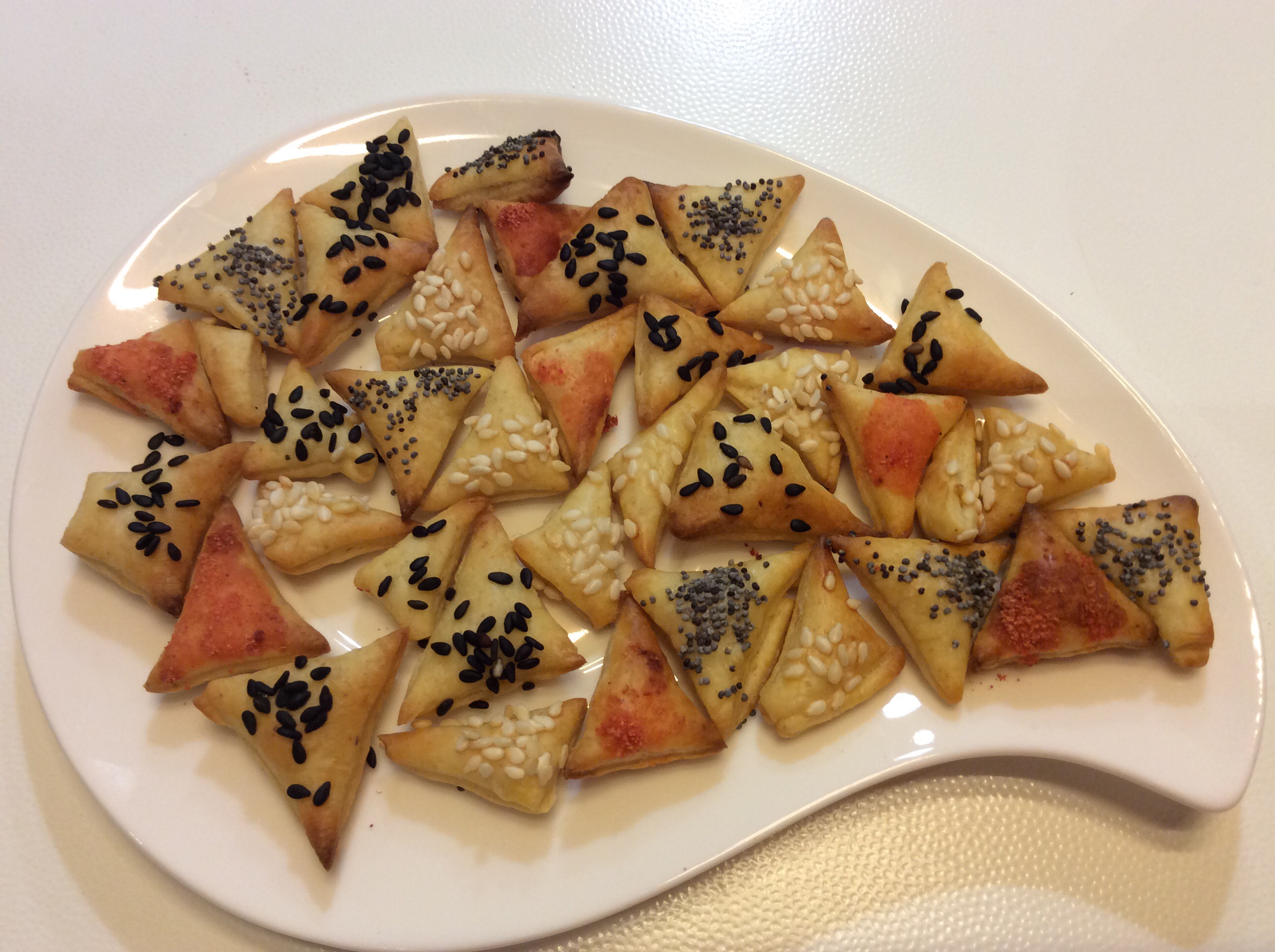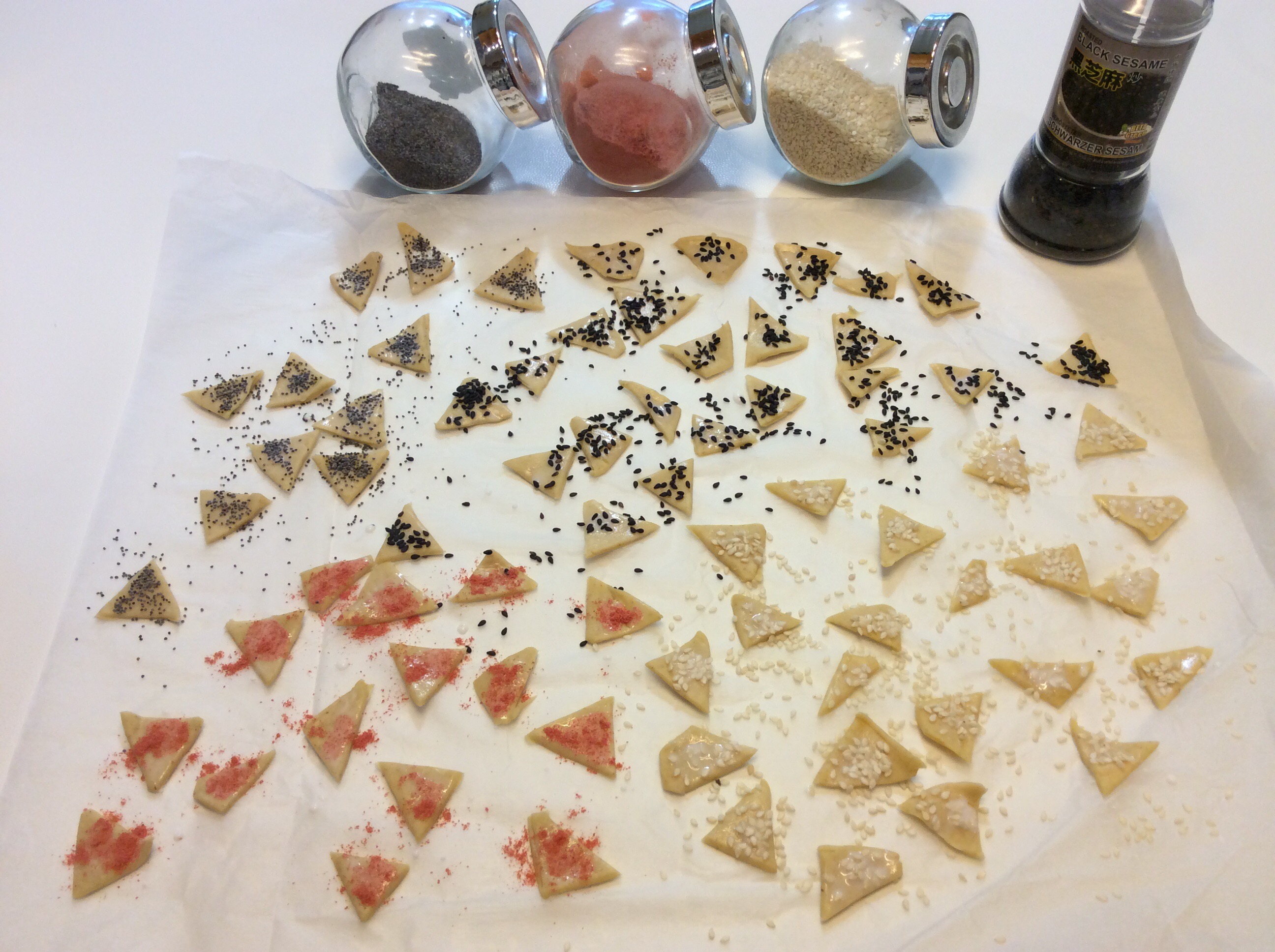 Li taglio a piccoli triangoli, li appoggiò sulla carta forno e dopo averli spennellati leggermente con il latte li cospargo di semi di sesamo bianchi e neri, paprica e semi di papavero li inforno a 200 gradi per 5 minuti, teneteli controllati perché cuociono in un attimo