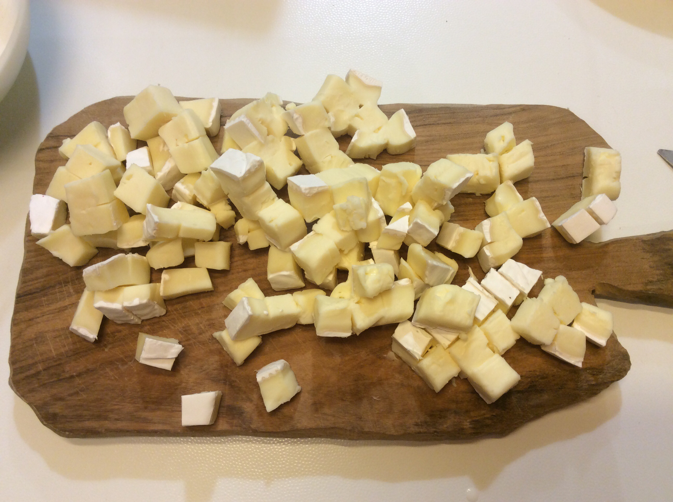 Taglio il brie a pezzettini anche la buccia, il brie è uno dei pochi formaggi di cui si mangia tutto