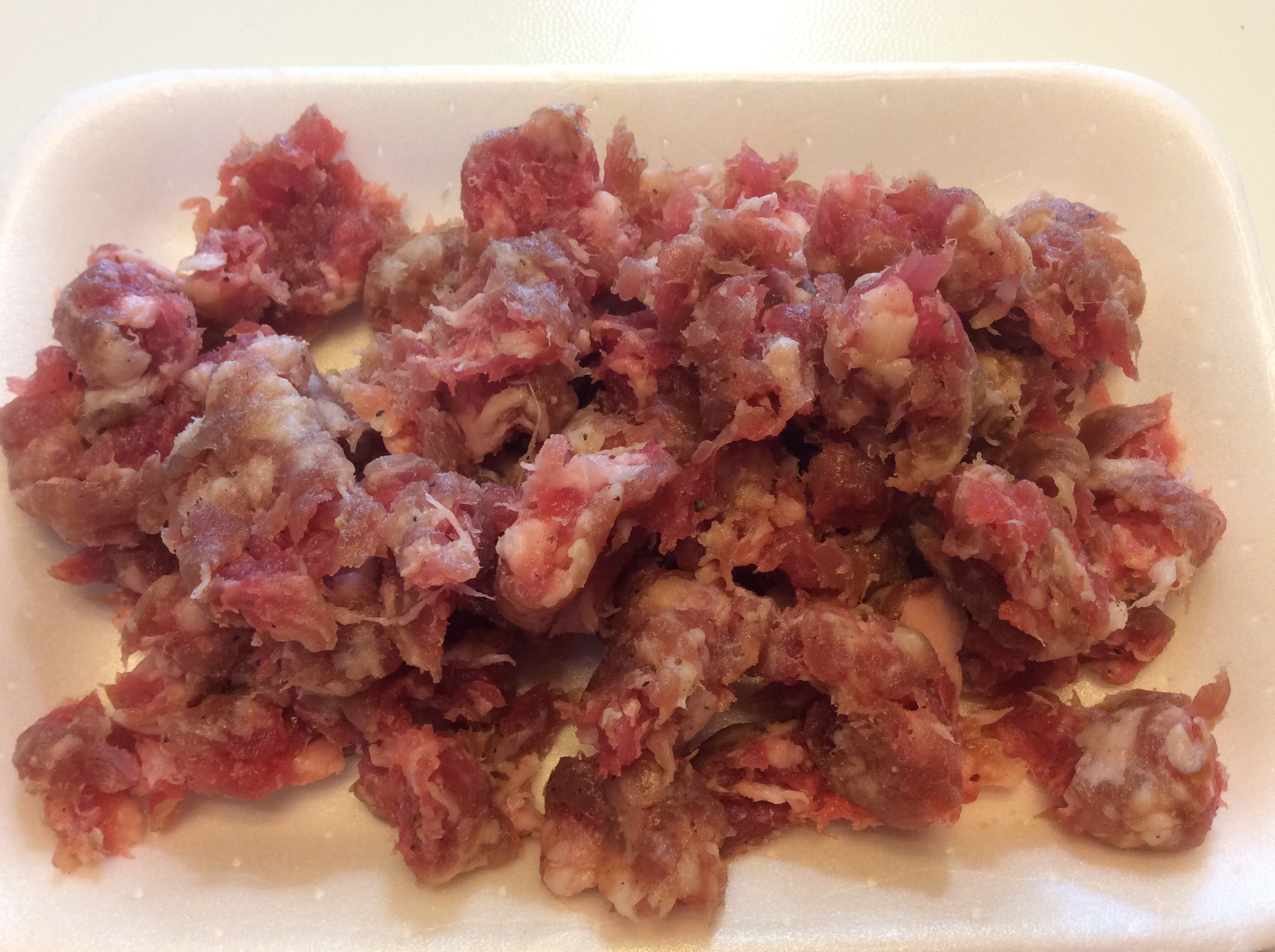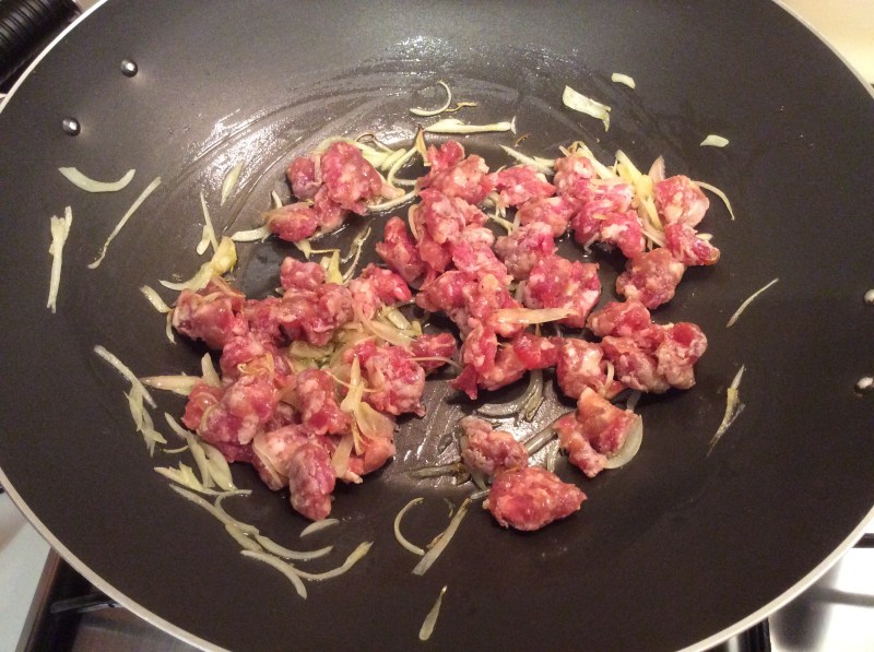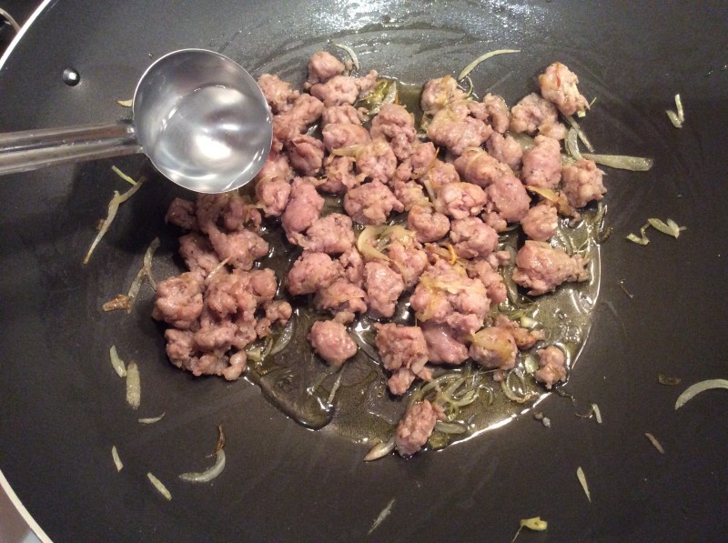 Nella padella dove poi condisco la pasta verso l’olio, aggiungo lo scalogno e lo lascio appassire, aggiungo la salsiccia
