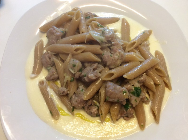 Cuocio le penne, le scolo al dente e le aggiungo alla salsiccia e finisco la cottura, se serve unisco qualche cucchiaio di acqua di cottura, manteco con il parmigiano, una macinata di pepe
