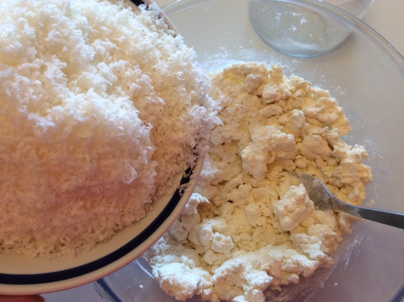 Preparo gli gnocchi versando la ricotta ben asciutta in una ciotola, io ho adoperato la ricotta di mucca, ma va benissimo anche quella di pecora, l’importante che sia asciutta in caso non lo fosse lasciatela scolare in un colino, aggiungo la farina e la lavoro con una forchetta