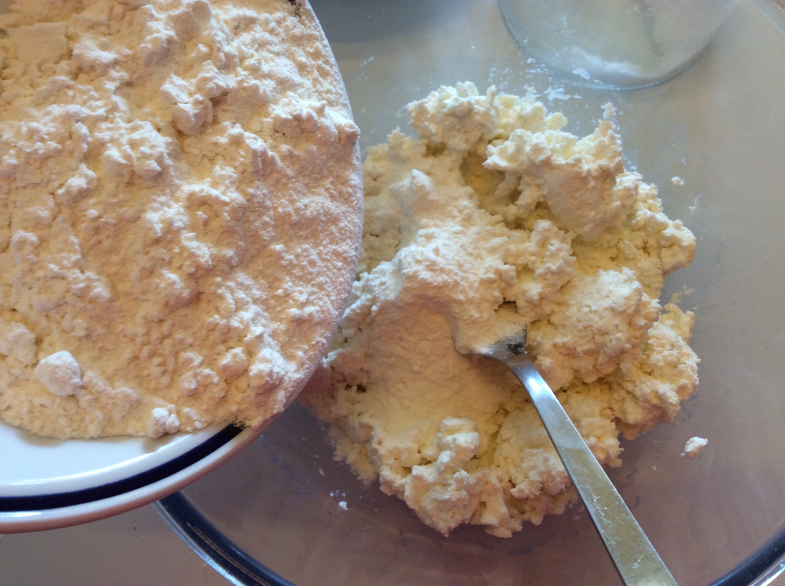 Preparo gli gnocchi versando la ricotta ben asciutta in una ciotola, io ho adoperato la ricotta di mucca, ma va benissimo anche quella di pecora, l’importante che sia asciutta in caso non lo fosse lasciatela scolare in un colino, aggiungo la farina e la lavoro con una forchetta