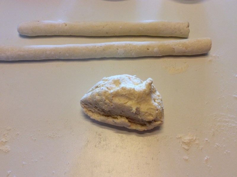 Con l’impasto ottenuto formo dei salsicciotti infarinando il piano di lavoro
