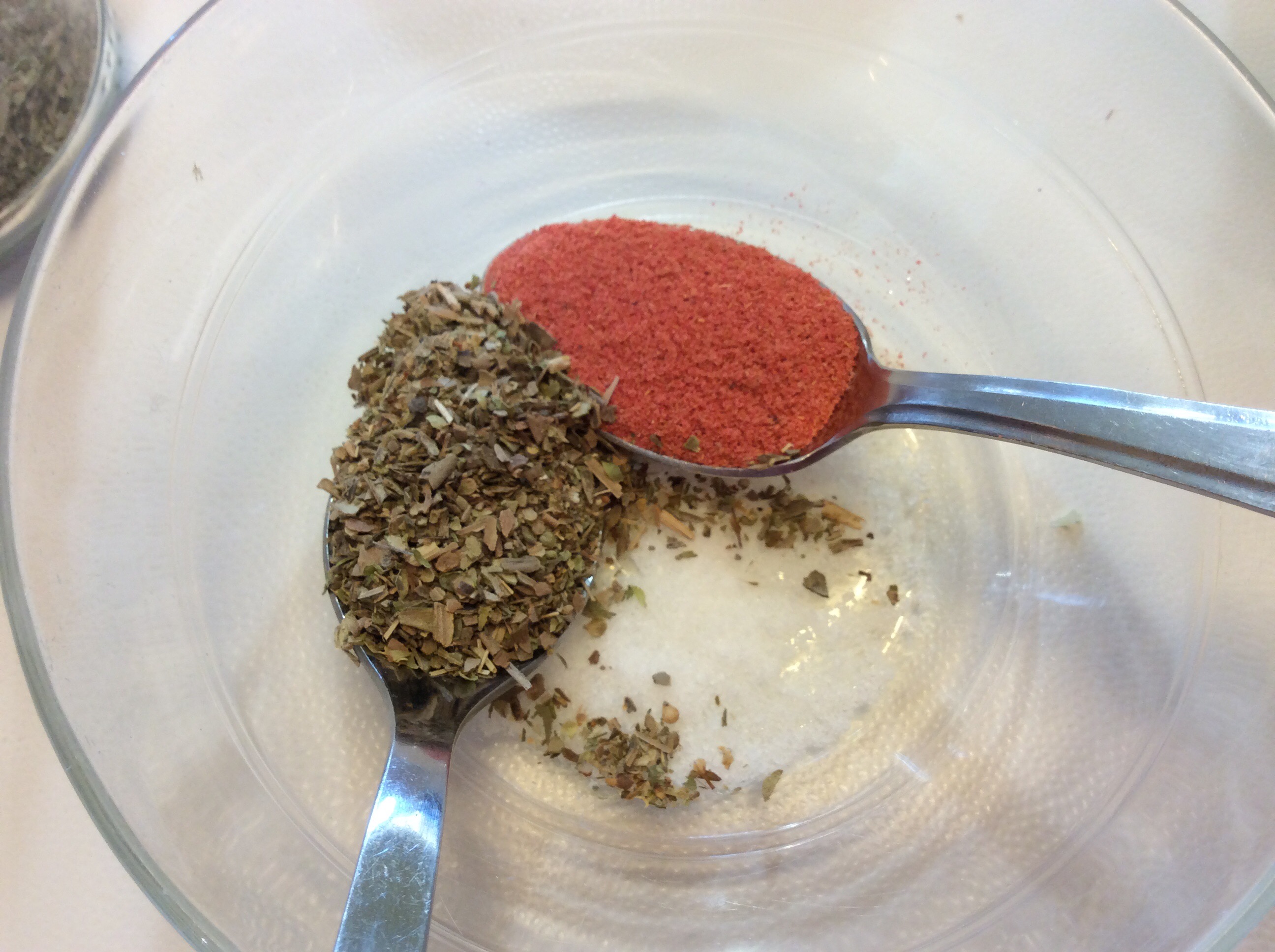 In una ciotola metto un cucchiaino di  sale, regolatevi voi dipende dalla quantità che ne preparate, un cucchiaino abbondante di paprica, io la preferisco piccante ma potete scegliere quella dolce, un paio di cucchiaini di origano e li verso sulle patate mescolando