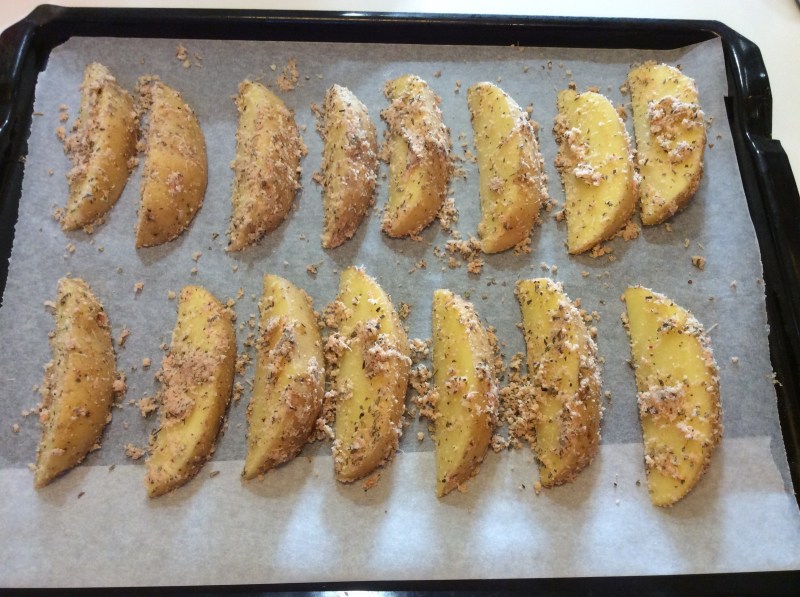 Massaggio bene le patate in modo da far aderire bene la panatura e le  dispongo su una placca rivestita di carta forno, tenetele separate le une dalle altre, infornate a 180 gradi per 30/40 minuti, dipende dalla loro dimensione, devono diventare croccanti e dorate