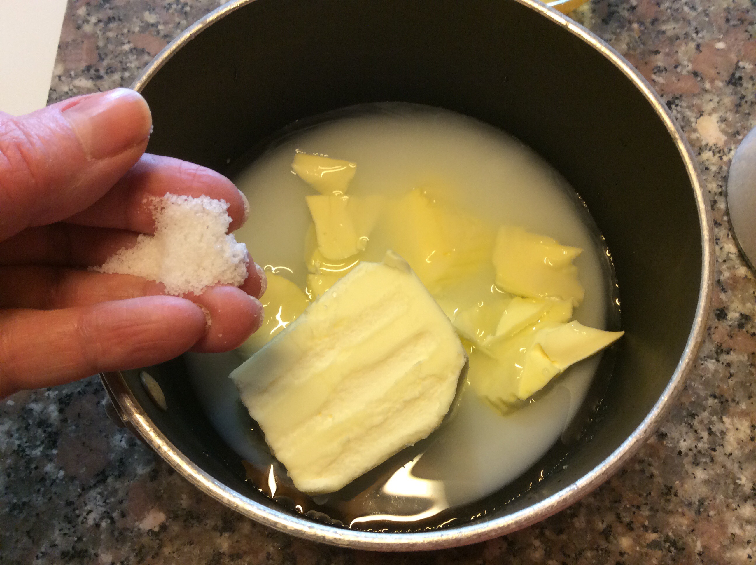 In un pentolino dal fondo spesso verso l’acqua, il latte il burro a pezzetti piccoli e un pizzico di sale