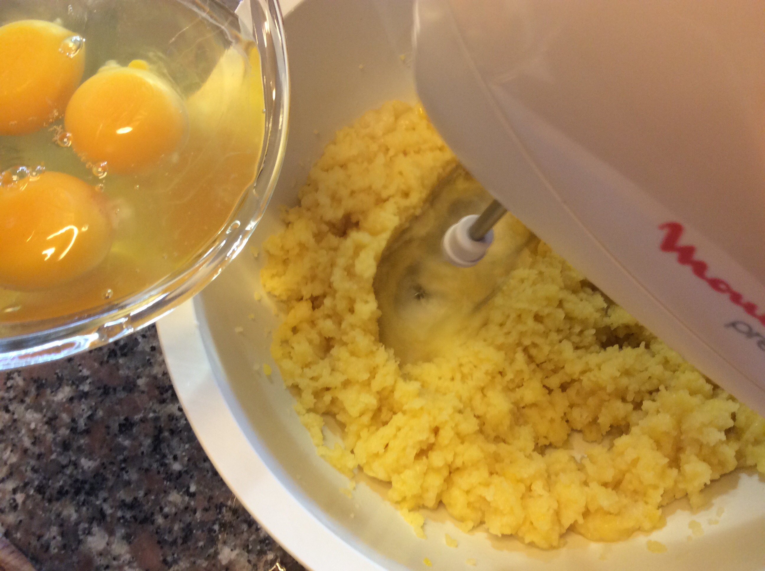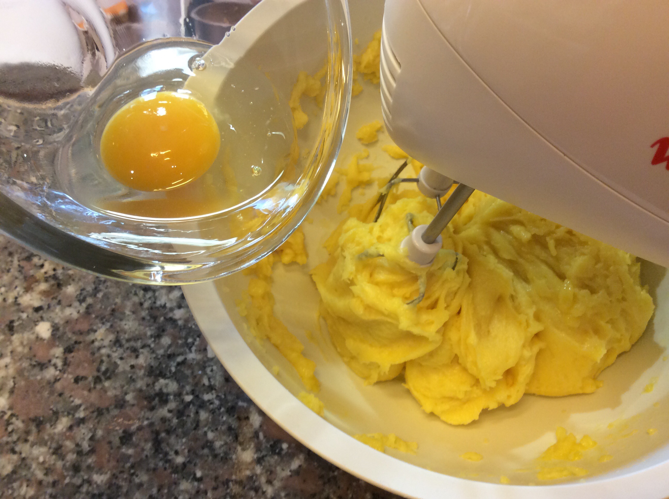Verso il composto in una ciotola se avete le fruste elettriche, oppure in planetaria con la frusta, allargo un po’ l’impasto e lo lascio intiepidire, con la planetaria lavoro per un minuto poi inizio ad aggiungere le uova 1 per volta inserendo la successiva quando la precedente è stata assorbita