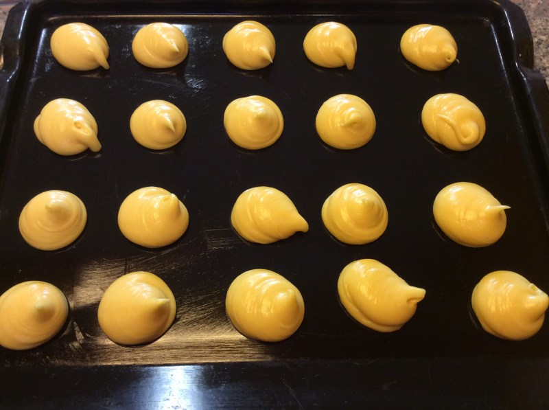 Imburro leggermente una placca da forno togliendo il burro in eccesso con un foglio di carta assorbente, Montersino consiglia di non mettere la carta forno perchè il bigné non lieviterà facendo una pancia alla base, sulla placca invece aderirà bene e in cottura si svilupperà in altezza, stampo i bigné io li ho fatti grandi come una noce