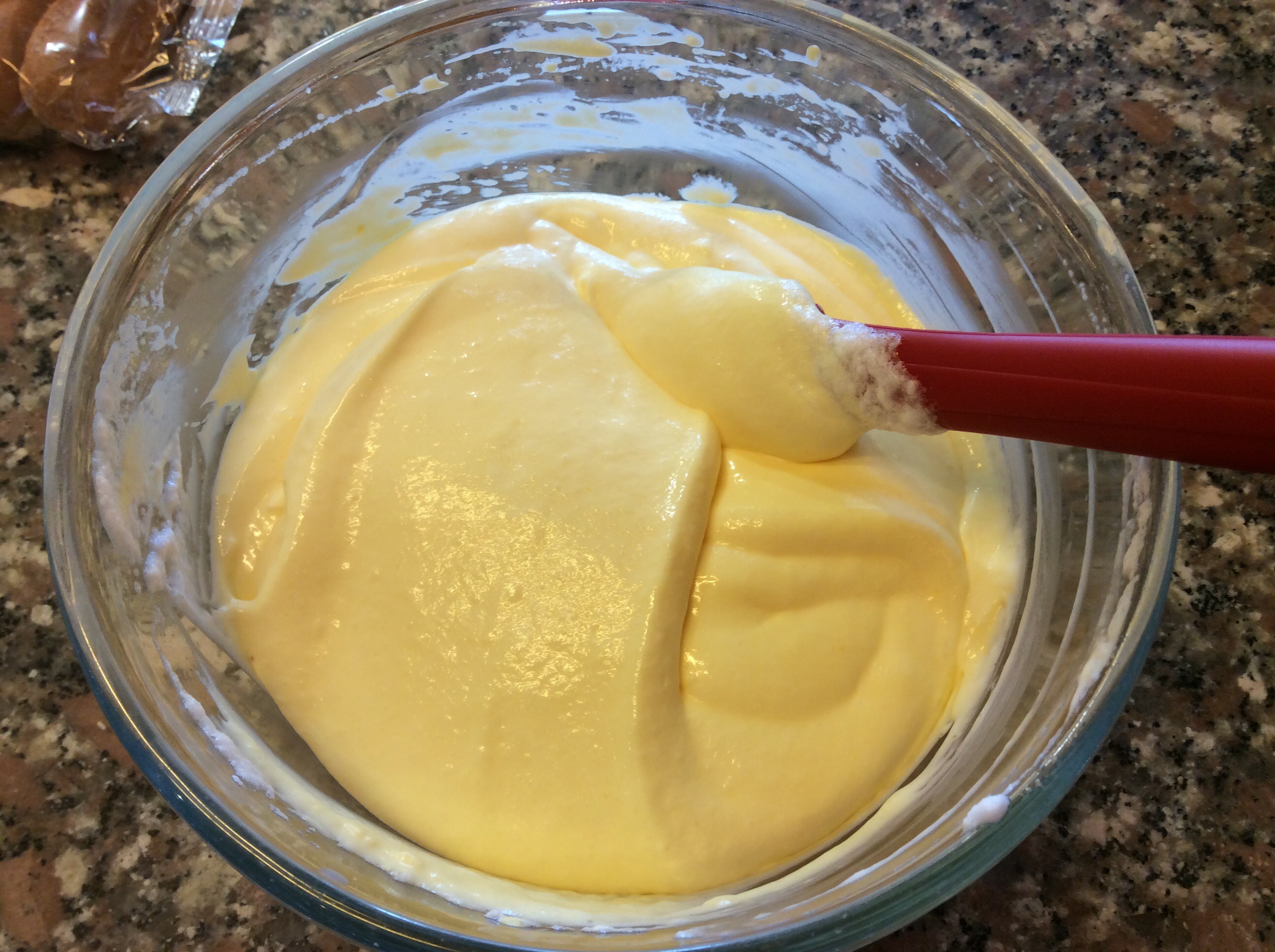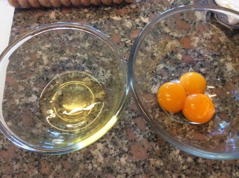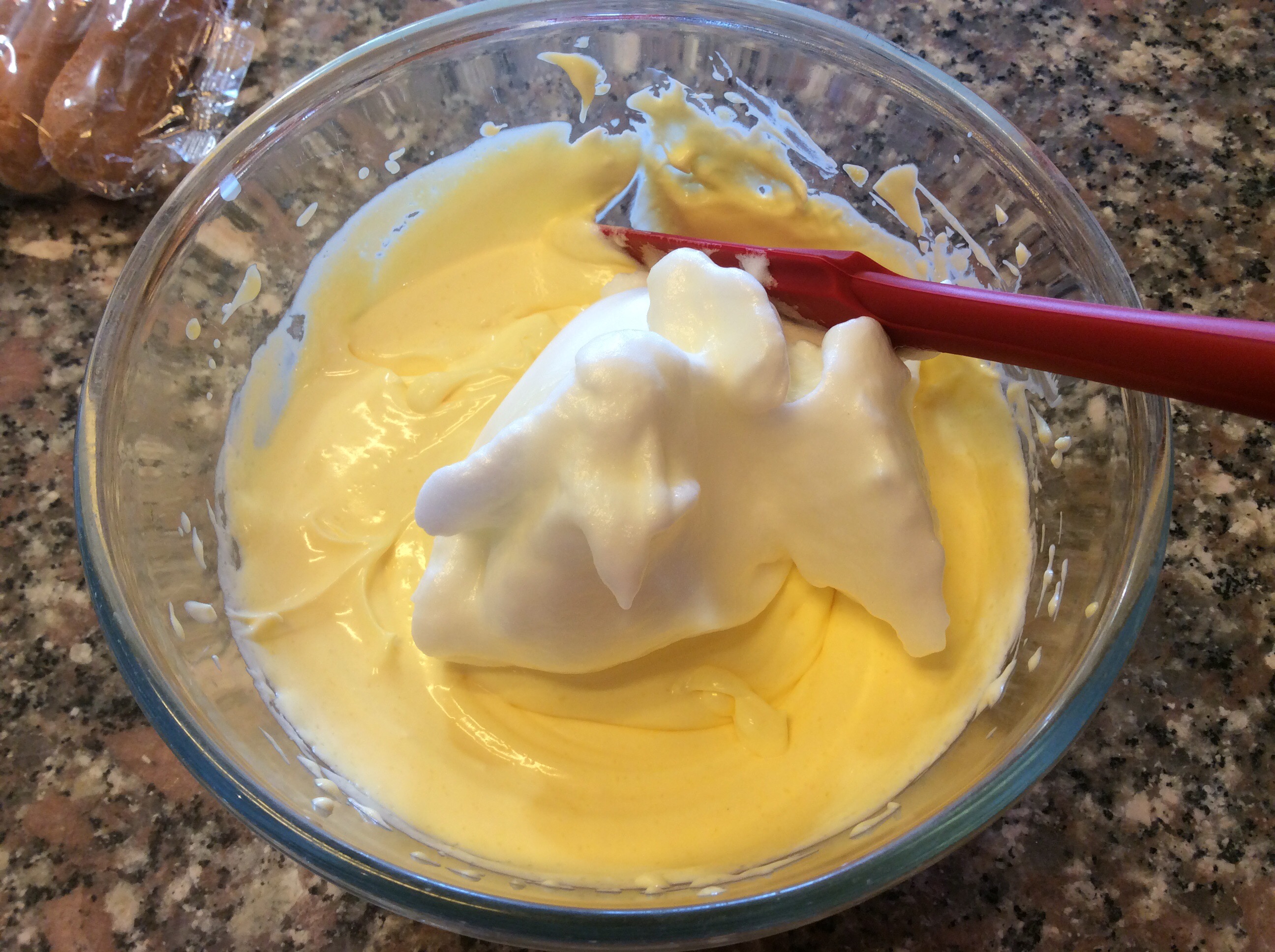 Unisco gli albumi ai tuorli mescolando dal basso verso l’alto per non smontarli