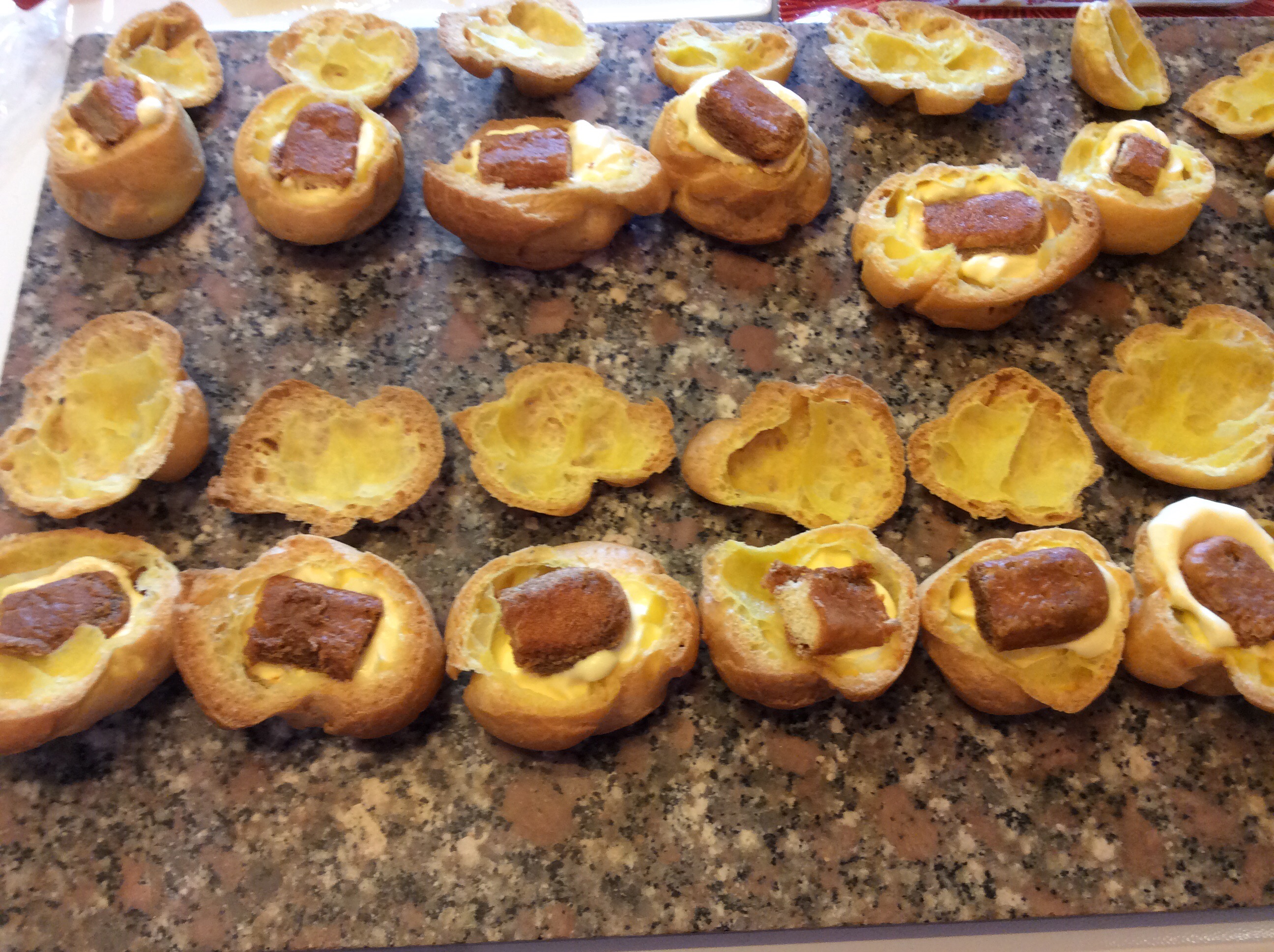 Ogni savoiardo lo taglio in tre pezzi e ne inserisco un pezzetto in ogni bigné sopra la crema