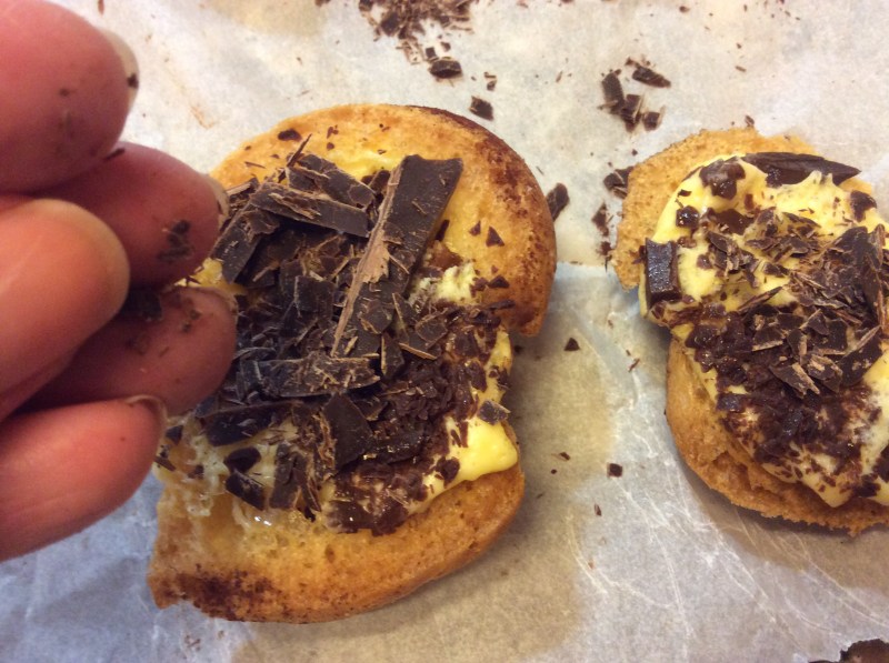 Trito il cioccolato in piccole scaglie e le distribuisco nei bigné