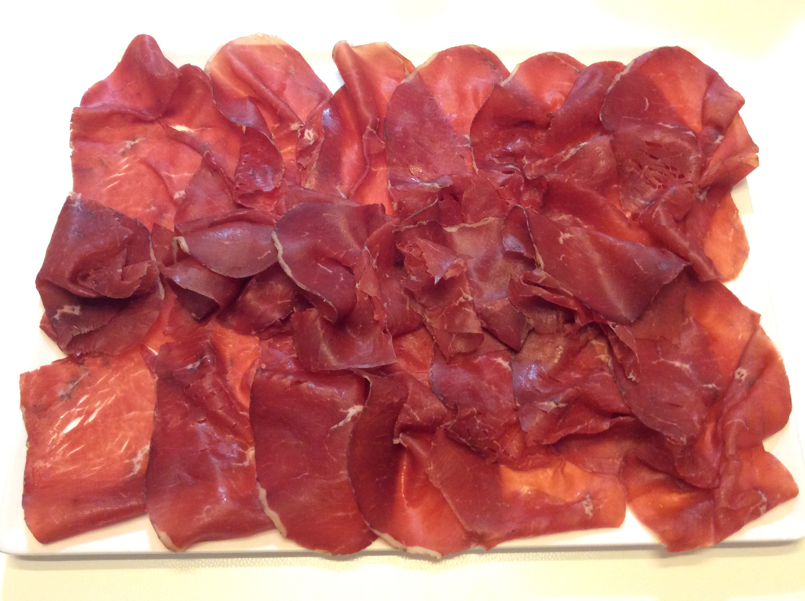 Dispongo le fettine di bresaola su un grande piatto in un solo strato