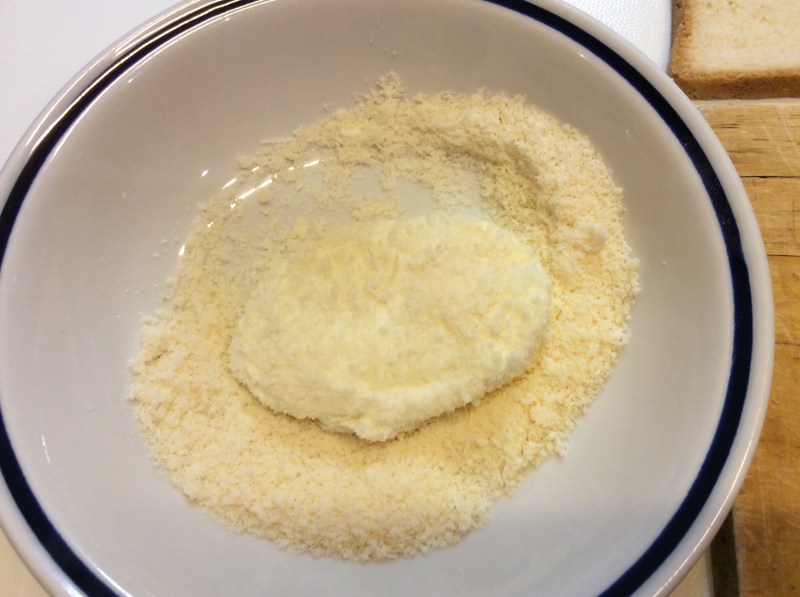 Affetto la mozzarella e la tampono con carta assorbente per eliminare il siero e le avvolgo nel formaggio grattugiato