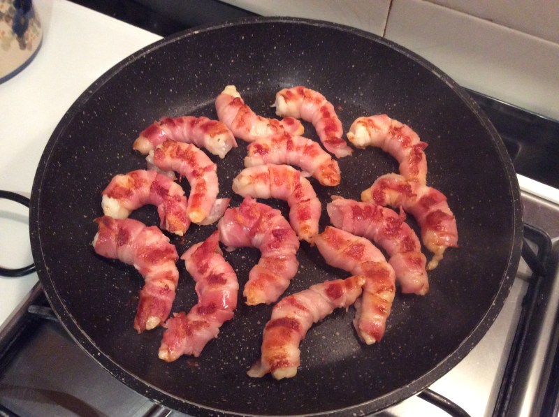 Quando sono rosolati da un lato li giro e li rosolo dall’altro, bastano 5 minuti a fiamma vivace, non serve aggiungere sale perchè la pancetta è già saporita